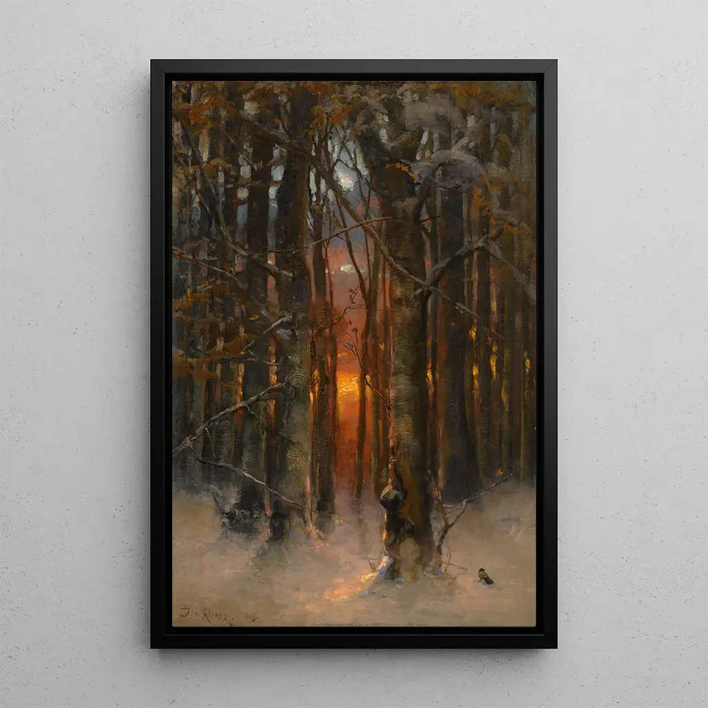 In this art print of Sunset through the trees, Julius Sergius Klever offers us a breathtaking scene where sunlight blends with dense foliage. The warm shades of orange and pink harmoniously merge, creating a soothing and contemplative atmosphere. Klever's technique, characterized by delicate brushstrokes and a keen attention to detail, brings this natural landscape to life. Every element, from the tree trunks to the reflections in the sky, contributes to a balanced composition that invites dreaming and escape.