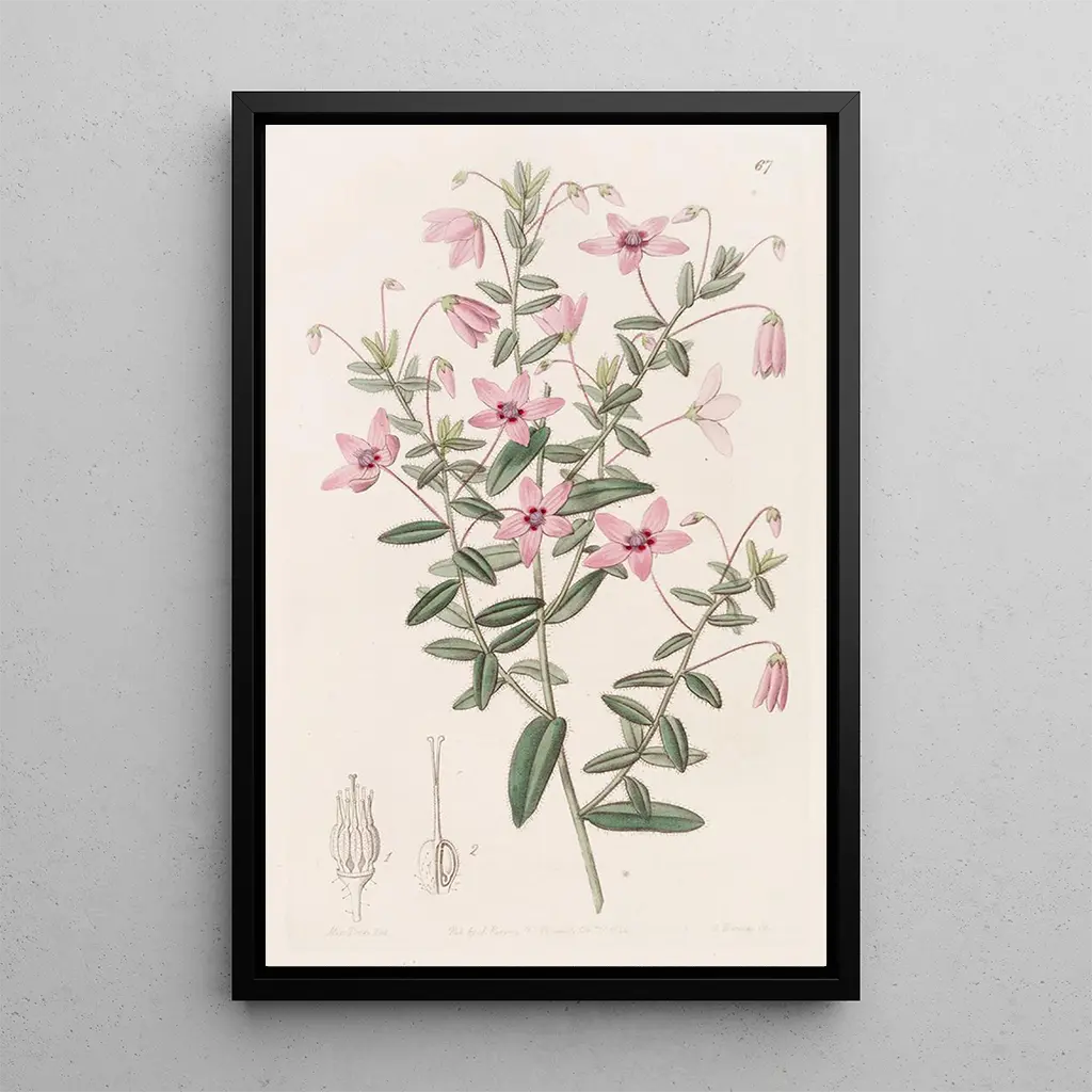 The art print of Tetratheca velue by Sydenham Edwards is a true celebration of Australian flora. With its shades of pink and green, this canvas evokes a lively and dynamic atmosphere. The precise details of the petals and leaves, rendered with a refined illustration technique, convey a sense of freshness and vitality. Each element of the composition seems to tell a story, inviting the viewer to explore the unique beauty of this iconic plant.
