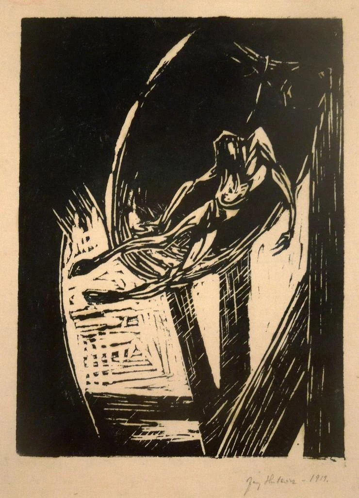 Dans "Le bourreau des cloches", Jerzy Hulewicz nous plonge dans un univers où les cloches semblent vibrer au rythme d'une mélodie tragique. La composition se distingue par des couleurs sombres, dominées par des nuances de gris et de noir, qui créent une atmosphère à la fois mystérieuse et poignante. Les formes stylisées des cloches, presque anthropomorphes, évoquent une lutte entre la vie et la mort, tandis que les ombres dansent autour d'elles, ajoutant une dimension dramatique à l'œuvre. La technique de Hulewicz, mêlant peinture et éléments graphiques, offre une profondeur visuelle captivante, invitant le spectateur à une réflexion sur le temps qui passe et les souvenirs qui résonnent.