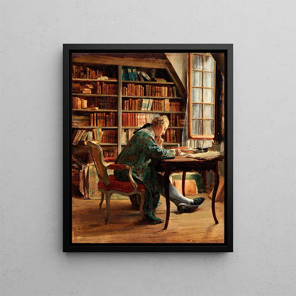 Meissonier, maître du réalisme, parvient à insuffler une vie vibrante à ses personnages. Dans "The Bibliophile", chaque détail est soigneusement élaboré, des textures des vêtements aux nuances des ombres. La lumière douce qui éclaire le visage du bibliophile crée une ambiance chaleureuse, presque sacrée, comme si le moment figé dans le temps était une ode à la contemplation. Le choix des couleurs, à la fois riches et subtiles, contribue à l'harmonie de la composition, tandis que la posture du personnage révèle une profonde concentration. Ce tableau ne se contente pas de représenter un homme en train de lire ; il évoque une expérience universelle, celle de la découverte, de l'évasion et de l'enrichissement intellectuel que procure un bon livre.