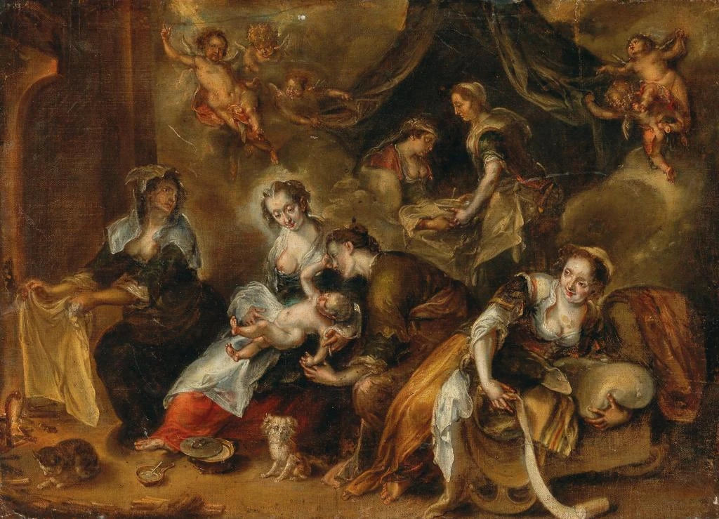 The Naissance de la Vierge, an emblematic work by Simon de Vos, evokes a scene filled with softness and serenity. The composition is distinguished by delicate pastel colors, where shades of blue and pink blend harmoniously. The oil painting technique allows for the creation of rich textures, emphasizing the details of the drapery and the expressions of the characters. The overall atmosphere of the piece invites contemplation, transporting the viewer to a sacred moment where the birth is celebrated with great fervor. Every element, from the radiant face of the Virgin to the protective gestures of the surrounding figures, contributes to an ambiance of peace and devotion.