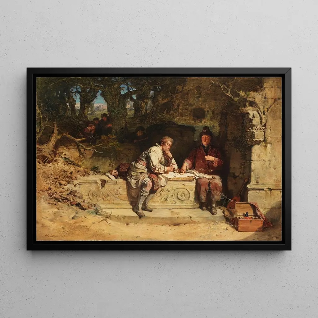 In "Les Tricheurs," John Ritchie immerses us in an intriguing atmosphere, where light plays a crucial role in emphasizing the characters' emotions. The dynamic composition highlights a group of players, whose faces betray tension and greed. The warm colors, dominated by earthy tones, create a striking contrast with the shadows, reinforcing the idea of duplicity. Ritchie's technique, blending realism with a touch of dramatization, invites the viewer to question the characters' intentions while offering an immersion into a captivating moment of life.
