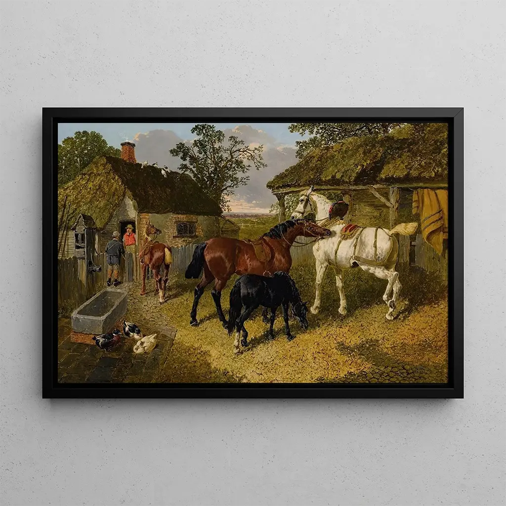 The art print La Cour de l'écurie by John Frederick Herring the Younger captures a lively and dynamic moment of farm life. The earthy colors and meticulous details of the animals and characters immerse the viewer in an animated scene where daily activity unfolds under a bright sky. Herring's technique, blending realism and sensitivity, allows you to feel the energy of this courtyard, where every element, from the horses to the peasants, seems to come to life. This art print evokes nostalgia for a simple and authentic way of life, while celebrating the beauty of rural life.