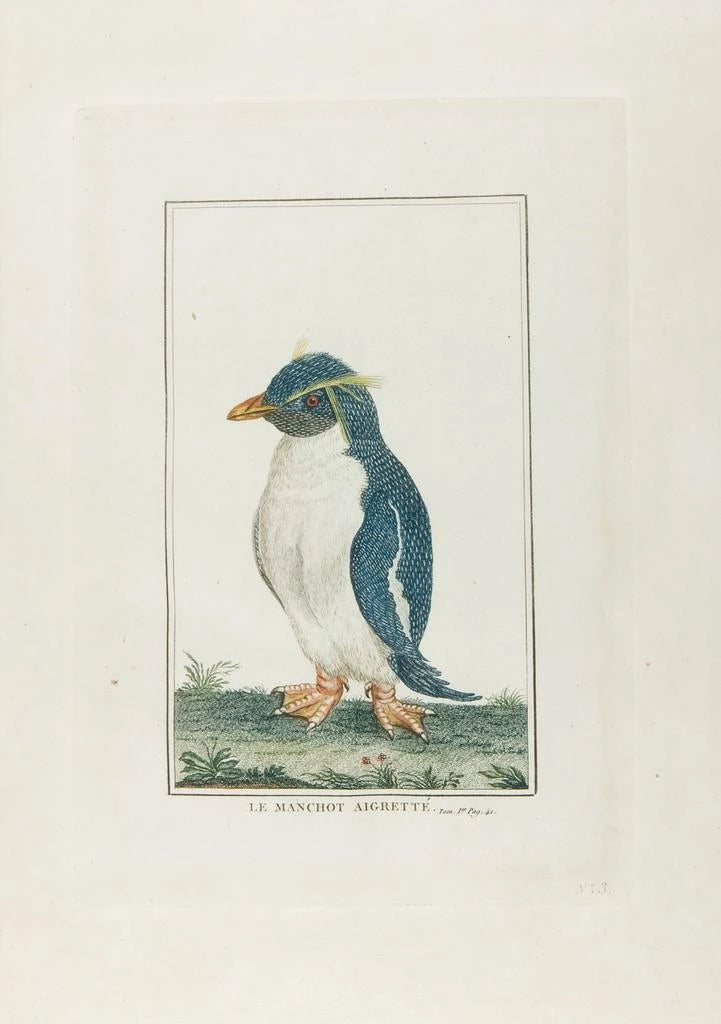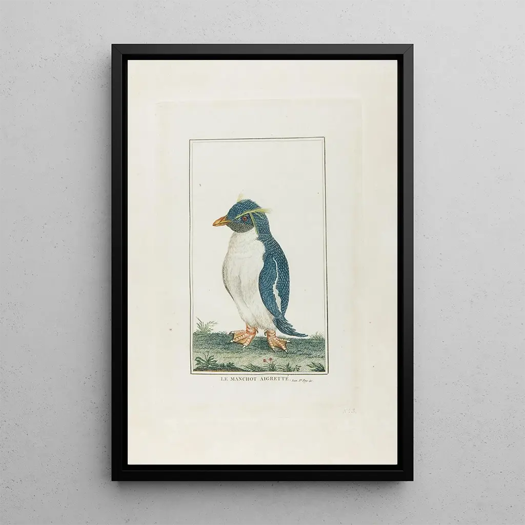 The egret penguin, an iconic work by François Levaillant, captures the very essence of marine wildlife. In this art print, the artist uses vivid hues and shades of blue to evoke the ocean, while the black and white plumage of the penguin stands out with elegance. The watercolor technique, delicate and precise, allows for detailed rendering of the animal, creating an atmosphere that is both serene and dynamic. This canvas invites deep contemplation of natural beauty, while highlighting the fragility of the marine ecosystem.