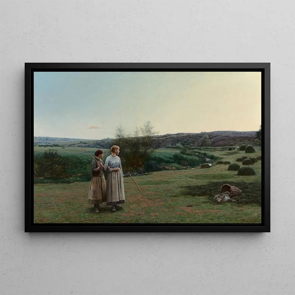 In the artwork "Rakes," Jean Ferdinand Monchablon immerses us in a bucolic scene where nature and man coexist harmoniously. The composition is dominated by warm tones, evoking the golden light of the setting sun that bathes the landscape. The rakes, symbols of agricultural work, are carefully arranged, creating a visual dynamic that draws the eye. Monchablon's technique, blending impressionism and realism, gives this canvas a peaceful and contemplative atmosphere, inviting the viewer to feel the serenity of a moment frozen in time.