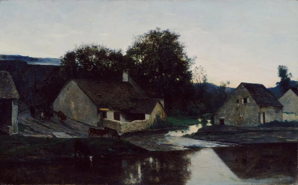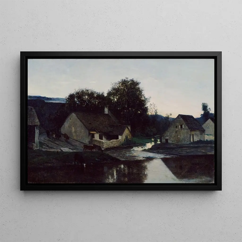 The art print of Le Hameau d'Optevoz by Charles François Daubigny transports the viewer to a peaceful landscape, where nature and architecture meet harmoniously. The soft, luminous hues evoke a golden light, while the details of the houses and trees create an atmosphere of tranquility. Daubigny's technique, characterized by quick and expressive brushstrokes, brings this rural scene to life. Every element, from the clouds to the reflections in the water, contributes to a balanced composition that invites escape and contemplation.