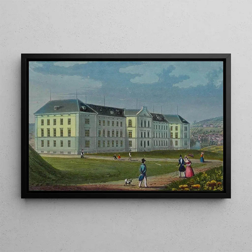 The art print of La Maison de la prébende, Hôtel-Dieu de Zurich by Franz Schmid transports us to the heart of a historic building, where architecture blends with history. This piece highlights the refined details of the facade, with its delicate ornaments and majestic windows. The warm, earthy colors evoke a welcoming atmosphere, while the light plays on the surfaces, accentuating the beauty of this iconic structure. Schmid's work invites exploration of the stories contained within this edifice, a symbol of a rich and vibrant cultural heritage.