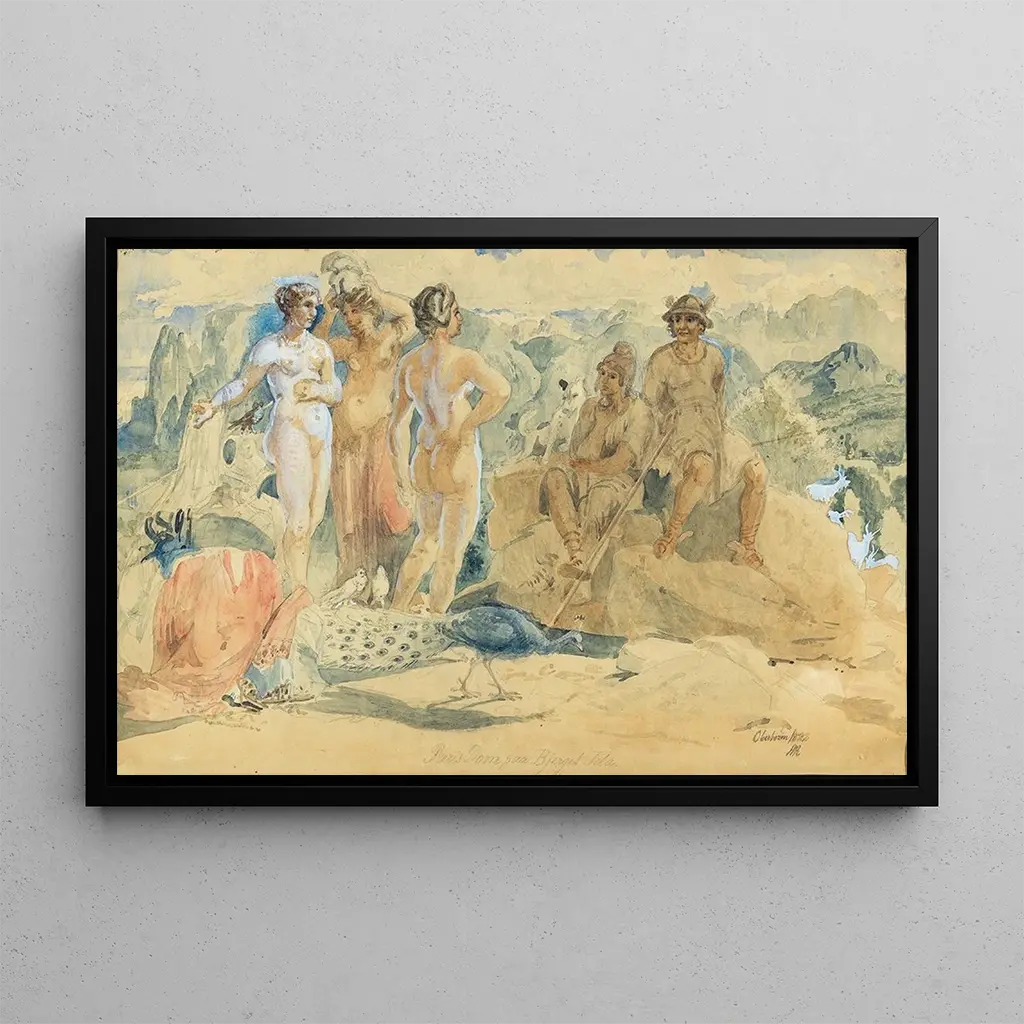 "The Judgment of Paris" is a captivating art print by Holger Roed, depicting a key moment from Greek mythology. In this vibrant scene, Paris, the Trojan prince, faces three goddesses, each claiming to be the most beautiful. The rich colors and meticulous details create an atmosphere that is both dramatic and enchanting. Roed's technique, blending realism and romanticism, brings the characters and their emotions to life, immersing the viewer in a mythological story where beauty and desire are at the heart of the conflict.