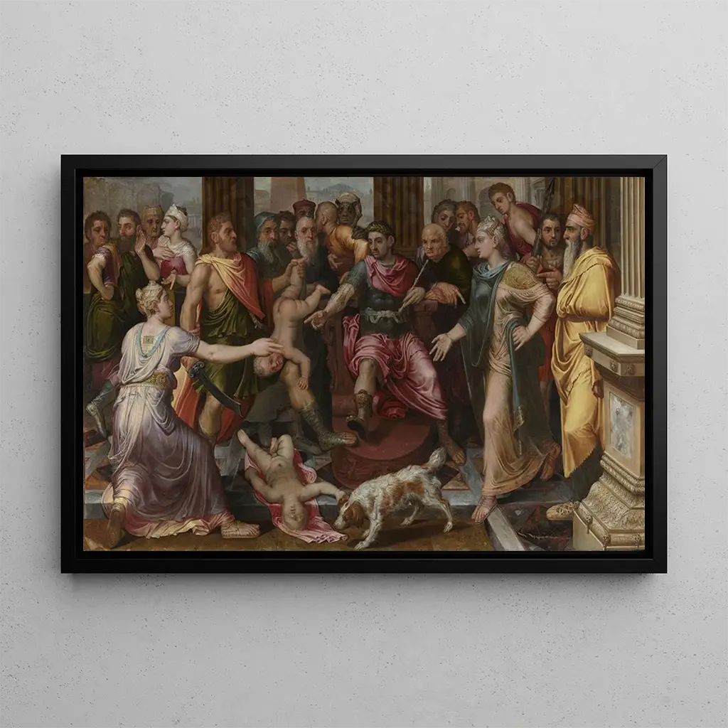 The art print of The Judgment of Solomon immerses us in an iconic scene of wisdom and discernment. Frans Floris, with his mastery of colors and shapes, highlights the crucial moment when King Solomon, surrounded by courtiers, must resolve a conflict between two women. The expressions of the characters, ranging from anguish to hope, are beautifully captured, creating a dramatic and captivating atmosphere. The richness of details and the depth of shadows add an almost theatrical dimension to this work, inviting the viewer to reflect on the nature of justice.