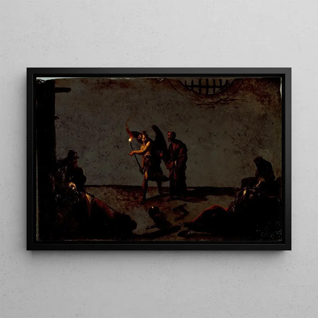 The Liberation of Saint Peter, an iconic work by Leonaert Bramer, immerses us in a biblical scene filled with serenity and mystery. The composition, rich in detail, highlights the central figure, Saint Peter, surrounded by a gentle light that illuminates his face. The warm colors, ranging from golds to browns, create a soothing atmosphere, while the shadows add striking depth to the scene. Bramer's technique, blending realism with dramatic elements, invites the viewer to feel the intensity of this moment of divine liberation.