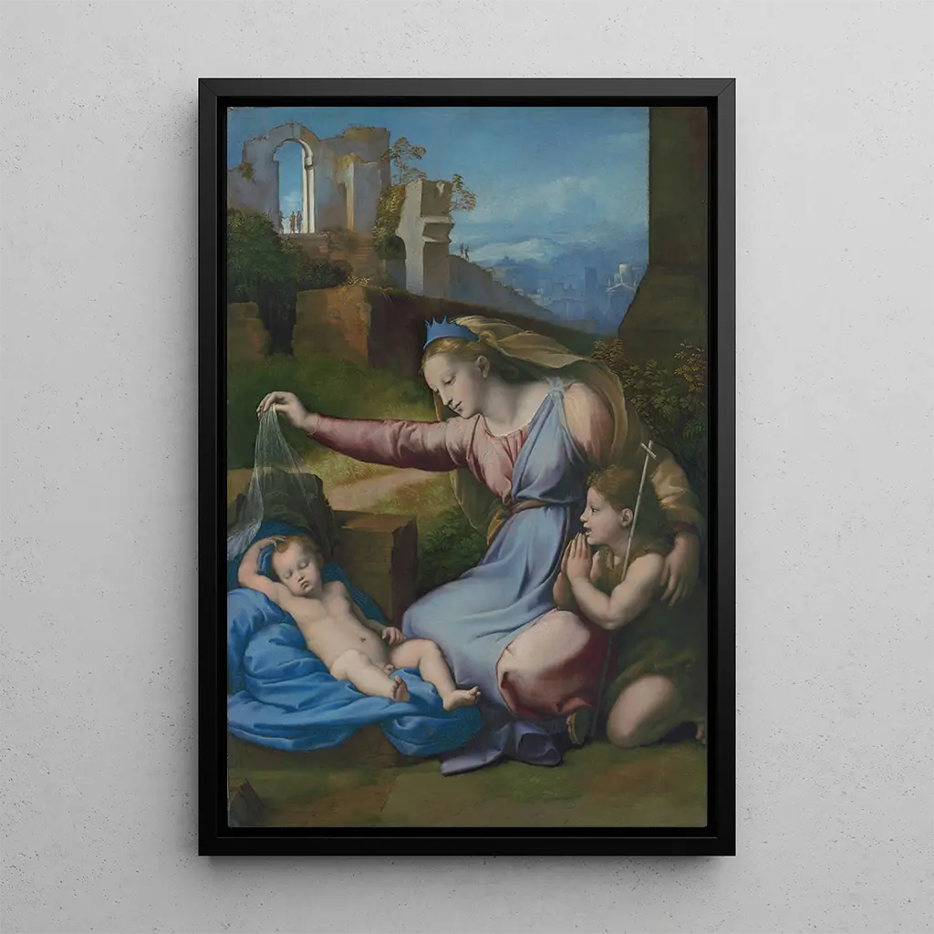 La Madone au diadème bleu, an emblematic art print by Raphael, is a sublime representation of the Virgin Mary, crowned with celestial beauty. The shades of deep blue and gold adorning the diadème delicately contrast with the warm tones of the flesh, creating an atmosphere that is both majestic and intimate. The posture of the Virgin, tenderly holding the Child Jesus, evokes a spiritual and human connection, while the refined details of the drapery and faces add a dimension of emotional depth to this art print. This piece embodies harmony and peace, characteristic of Raphael's style.