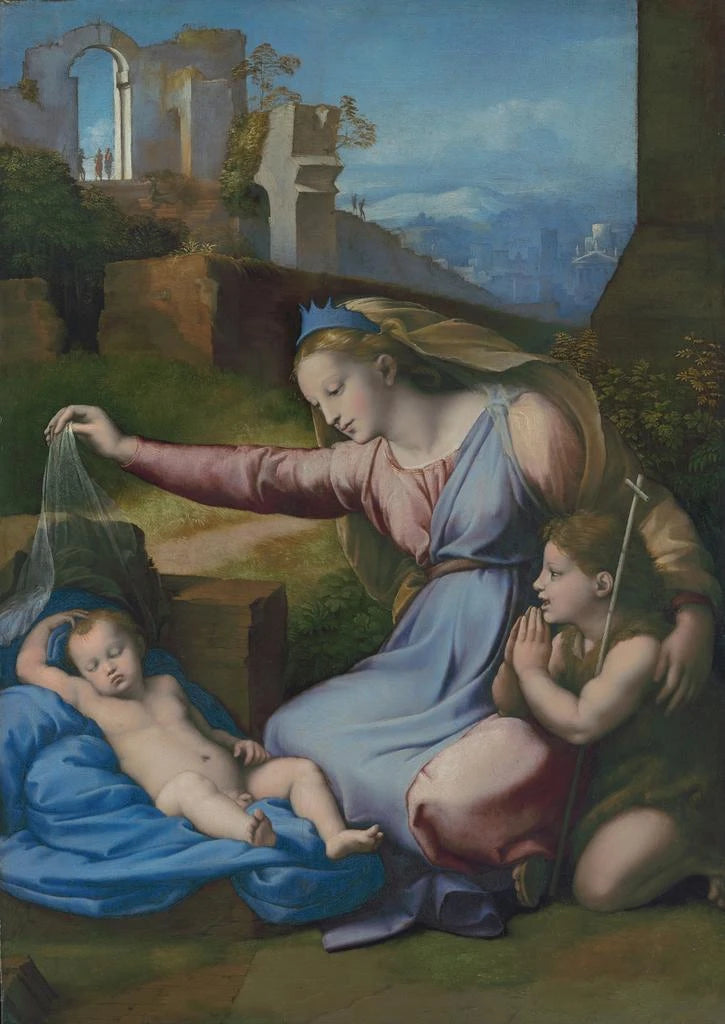 Raphael, born in 1483, is one of the most influential artists of the Italian Renaissance. His work, marked by a pursuit of perfection and harmony, was shaped by his interactions with other great masters of the era. La Madone au diadème bleu, painted around 1506, perfectly illustrates his unique style, combining realism and idealization. This art print testifies to the importance of the depiction of the Virgin in Christian art, while reflecting the humanist values of the Renaissance, where the individual and spirituality are emphasized.