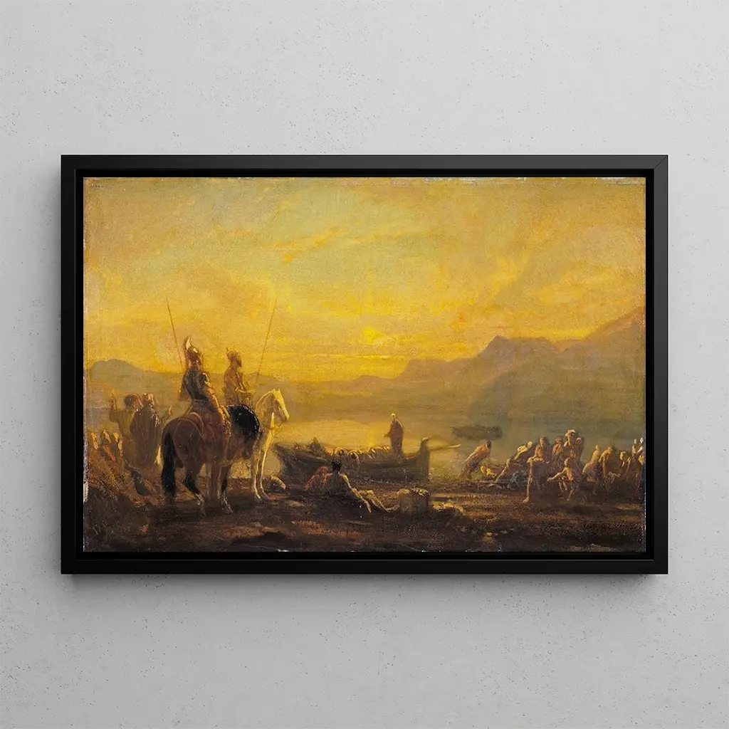 "The Miraculous Catch" by Alexandre-Gabriel Decamps is an art print that captures a moment of divine grace, where humanity encounters the supernatural. The luminous tones and meticulous details of the characters immerse the viewer in a vibrant scene of life and spirituality. The oil on canvas technique allows Decamps to play with shades of light, creating an atmosphere that is both serene and dynamic. Every element of the composition, from the radiant faces to the reflections in the water, contributes to a visual storytelling that evokes faith and hope, while celebrating the beauty of nature.