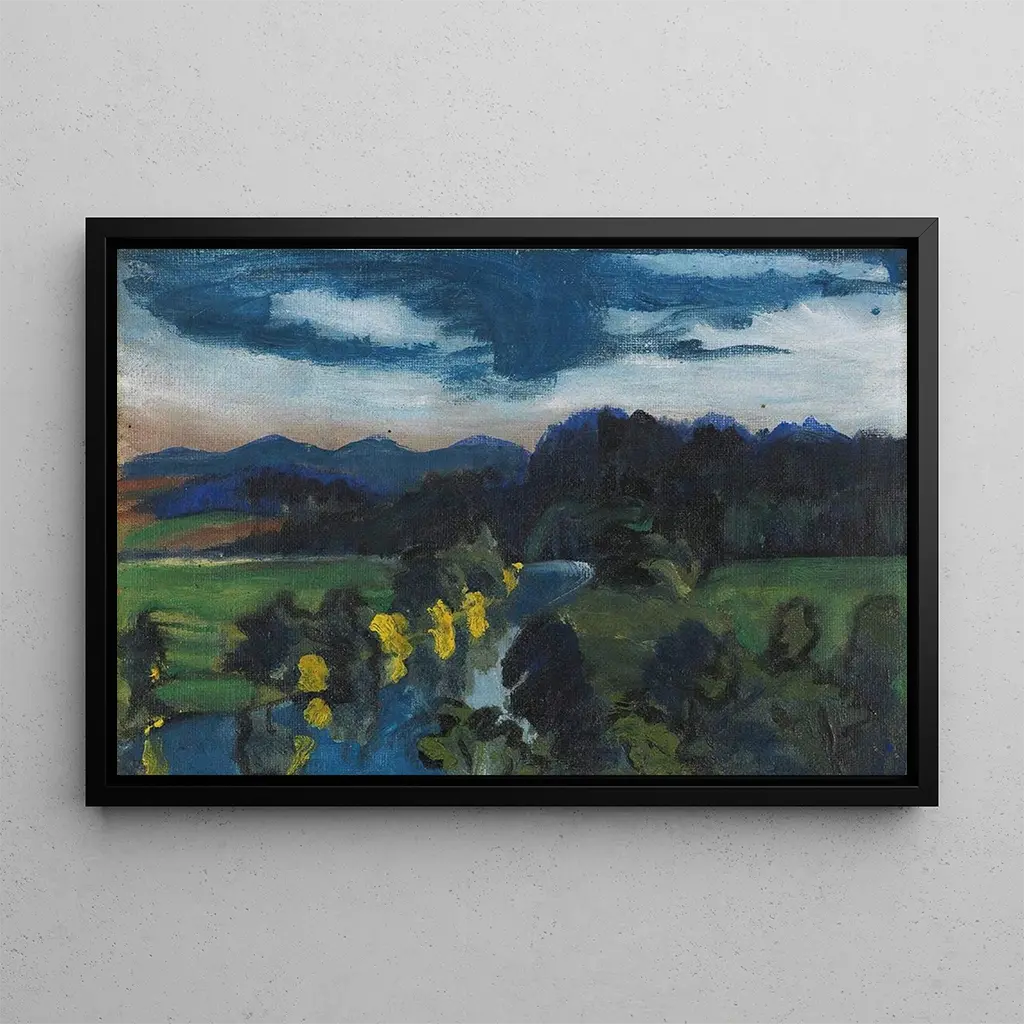 La Mulde near Lichtenwalde is a captivating art print that evokes an atmosphere that is both peaceful and dynamic. Kirchner, using vivid colors and bold brushstrokes, manages to convey the energy of the surrounding nature. The artwork depicts a riverside landscape where the light plays on the water, creating shimmering reflections. The trees, stylized and almost abstract, seem to dance in the breeze, while the sky, in a bright blue, invites daydreaming. This art print of La Mulde near Lichtenwalde is a true invitation to contemplate natural beauty.