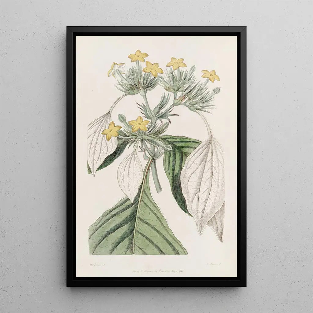 The Mussaenda with Large Leaves: a burst of greenery and light The Mussaenda with large leaves, a work by Sydenham Edwards, evokes a tropical lushness through its broad green leaves and vibrant flowers. Every detail is carefully rendered, from the leaf veins to the delicate nuances of the petals, creating a harmonious composition that captures the eye. The watercolor technique, with its subtle gradations, conveys the freshness and vitality of this plant, while offering a soothing atmosphere. This art print invites escape, transporting the viewer to exotic landscapes where nature reigns supreme. Sydenham Edwards: the botanical artist dedicated to science Sydenham Edwards, a botanical illustrator of the early 19th century, played a vital role in documenting the plant species of his time. His training in botany allowed him to combine scientific precision with artistic sensitivity, making his works references for both botanists and art enthusiasts. His illustrations, often published in botanical books, contributed to the popularization of many plants, including the Mussaenda, and helped raise public awareness of the richness of flora. Edwards is thus considered a pioneer in the field of botanical illustration. A decorative acquisition with multiple advantages The art print of The Mussaenda with large leaves is a decorative choice that will bring a touch of nature to your interior, whether in a living room, office, or bedroom. Its printing quality ensures remarkable fidelity to the colors and details of the original work, paying tribute to Edwards' talent. This piece, both vibrant and calming, fits perfectly into various decorating styles, adding a note of elegance and freshness. By choosing this canvas, you opt for a work that will enrich your space while inspiring admiration from your visitors.