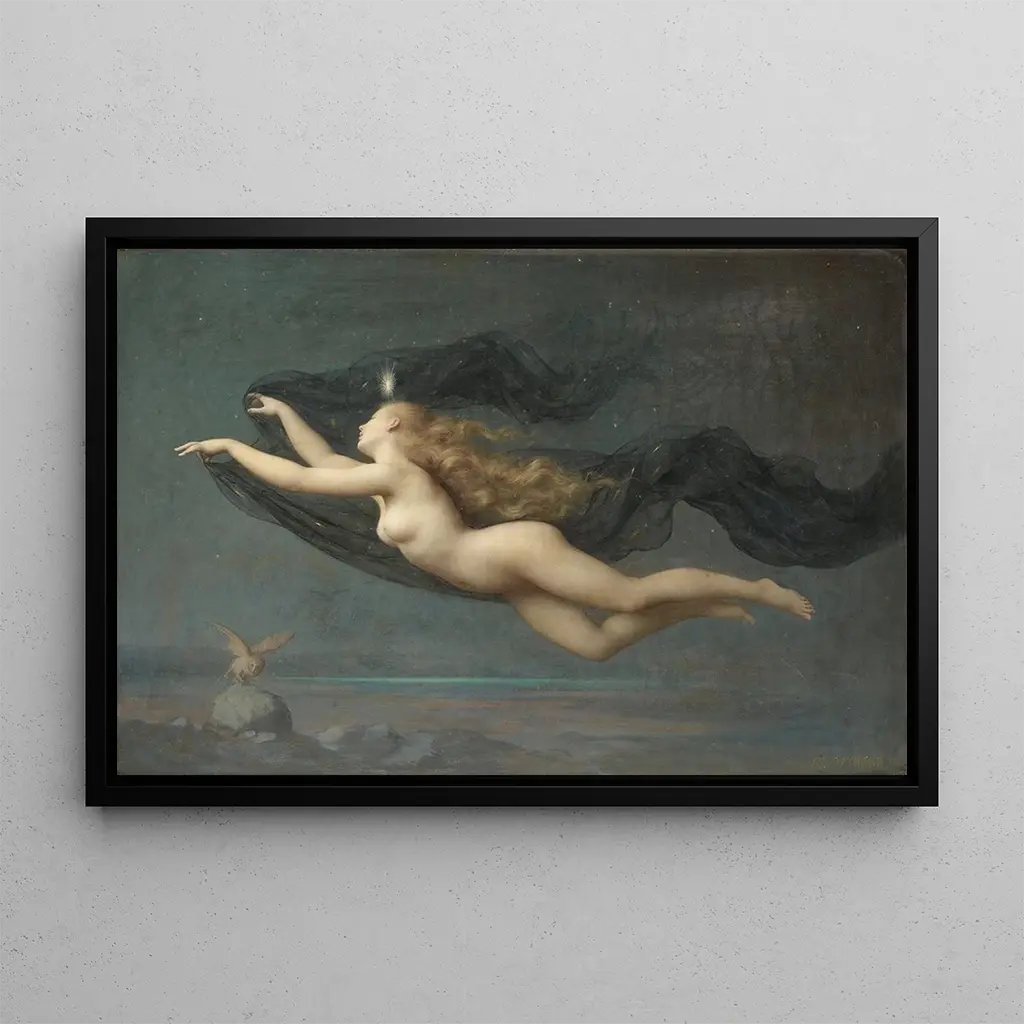 La Nuit : un voyage dans l'obscurité étoilée La Nuit d'Auguste Raynaud est une œuvre qui invite à la rêverie et à l'évasion. La toile, dominée par des nuances de bleu profond et des touches d'or scintillantes, évoque une atmosphère mystérieuse et sereine. Les étoiles, délicatement peintes, semblent danser dans le ciel nocturne, tandis que les silhouettes sombres des arbres ajoutent une profondeur à la composition. Raynaud réussit à capturer l'essence même de la nuit, offrant au spectateur une expérience immersive et contemplative. Chaque coup de pinceau témoigne d'une maîtrise technique qui transcende le simple paysage, transformant la toile en un poème visuel. Auguste Raynaud : un maître du paysage romantique Auguste Raynaud, actif au XIXe siècle, est reconnu pour ses paysages empreints de poésie et de mélancolie. Influencé par le mouvement romantique, il s'inscrit dans une tradition artistique qui valorise la nature et l'émotion. Raynaud a su tirer parti des techniques de la peinture à l'huile pour créer des atmosphères évocatrices, souvent inspirées par des scènes nocturnes. Son travail, bien que moins connu que celui de certains de ses contemporains, a contribué à enrichir le patrimoine artistique français, témoignant d'une sensibilité unique à la beauté du monde naturel. Une acquisition décorative aux multiples atouts La reproduction de La Nuit est un choix idéal pour embellir votre intérieur, que ce soit dans un salon, un bureau ou une chambre. Sa palette de couleurs apaisantes et son ambiance rêveuse apportent une touche de sérénité à n'importe quel espace. La qualité de la reproduction garantit une fidélité remarquable à l'œuvre originale, permettant de savourer chaque détail. En intégrant ce tableau dans votre décoration, vous offrez à votre environnement une dimension artistique et poétique, tout en suscitant l'admiration de vos invités.