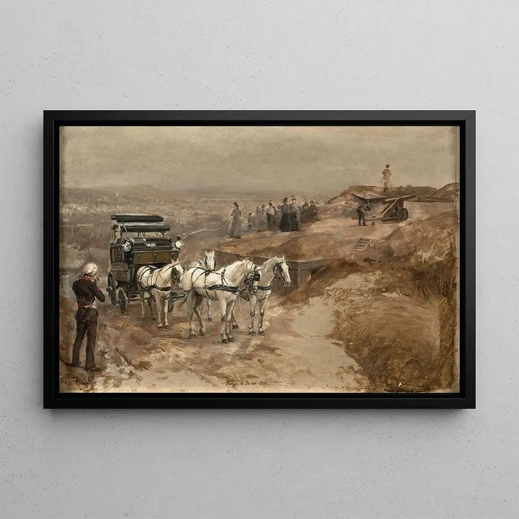 The artwork "The Siege of Paris 1871" by Jules Girardet captures with remarkable intensity the tumult of the Franco-Prussian War. The dark, earthy colors dominate the composition, evoking an atmosphere of despair and resilience. The characters, frozen in dramatic postures, bear witness to the suffering and anxiety that prevailed during this period. Girardet employs oil painting techniques that bring details to life, from faces marked by hardship to urban landscapes in ruins. This piece is an invitation to contemplation, a moving reminder of the trials endured by the Parisian population.