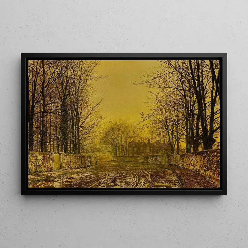 The Royal Road, an iconic work by John Atkinson Grimshaw, transports us into a melancholic and poetic atmosphere. This art print, created with refined oil painting techniques, depicts a street illuminated by the soft light of dusk. The shades of blue and gold blend harmoniously, creating a striking contrast between the shadow of the trees and the warmth of the streetlights. The meticulous details of the buildings and foliage reveal a world that is both lively and serene, inviting the viewer to a peaceful contemplation. Grimshaw succeeds in capturing the essence of urban life while preserving a touch of magic.