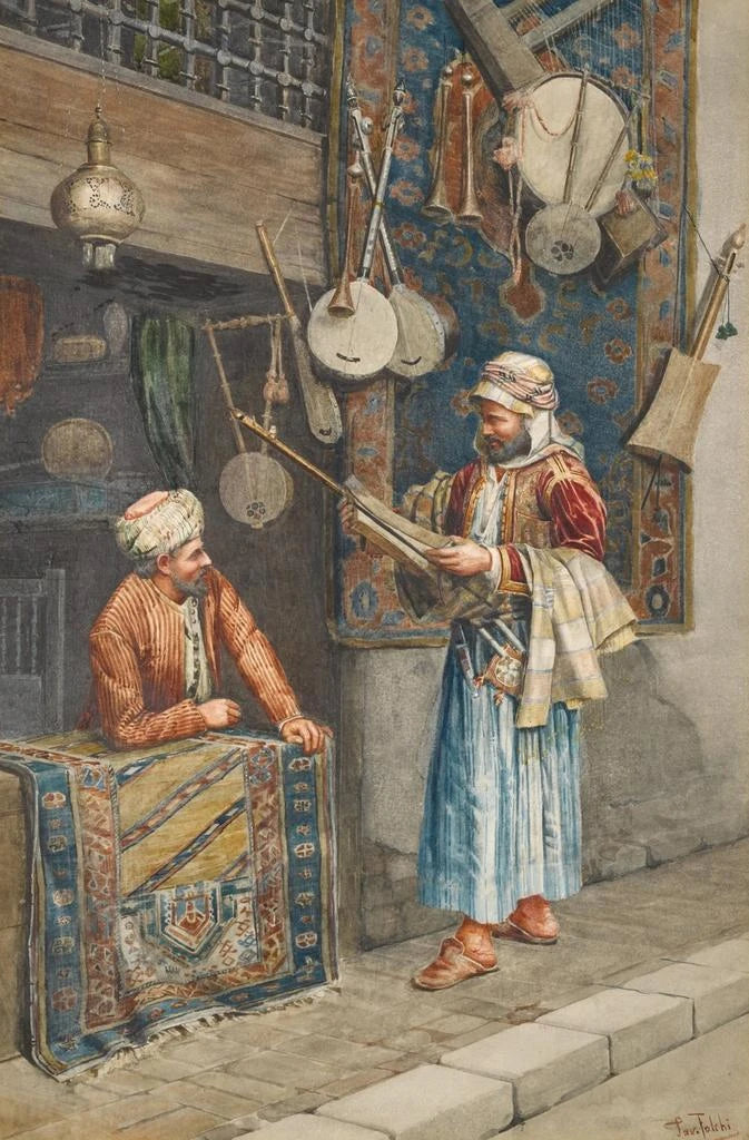 The Music Instrument Seller, a work by Paolo Folchi, captures an animated scene where music and everyday life intersect. The painting depicts a merchant surrounded by various instruments, ranging from violins to flutes, creating a joyful and festive atmosphere. The vivid colors and meticulous details of the instruments draw the eye and evoke a sense of conviviality. Folchi's technique, characterized by dynamic brushstrokes, brings this scene to life, almost making the melody that could emanate from it audible.