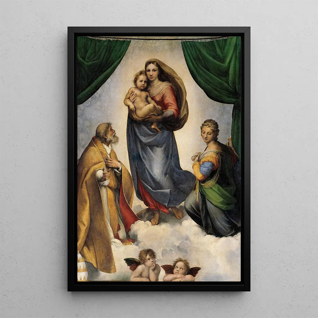 Raphaël, né en 1483 à Urbino, est l'un des artistes les plus emblématiques de la Renaissance. Influencé par Léonard de Vinci et Michel-Ange, il développe un style unique qui allie harmonie et beauté. La Madone Sixtine, commandée pour la chapelle Sixtine, témoigne de son génie créatif et de son habileté à représenter des sujets religieux avec une profondeur émotionnelle. Au cours de sa carrière, Raphaël a également été un grand architecte et un décorateur, laissant un héritage durable dans l'histoire de l'art. Sa capacité à capturer l'essence humaine à travers ses œuvres a fait de lui une figure incontournable de son époque.