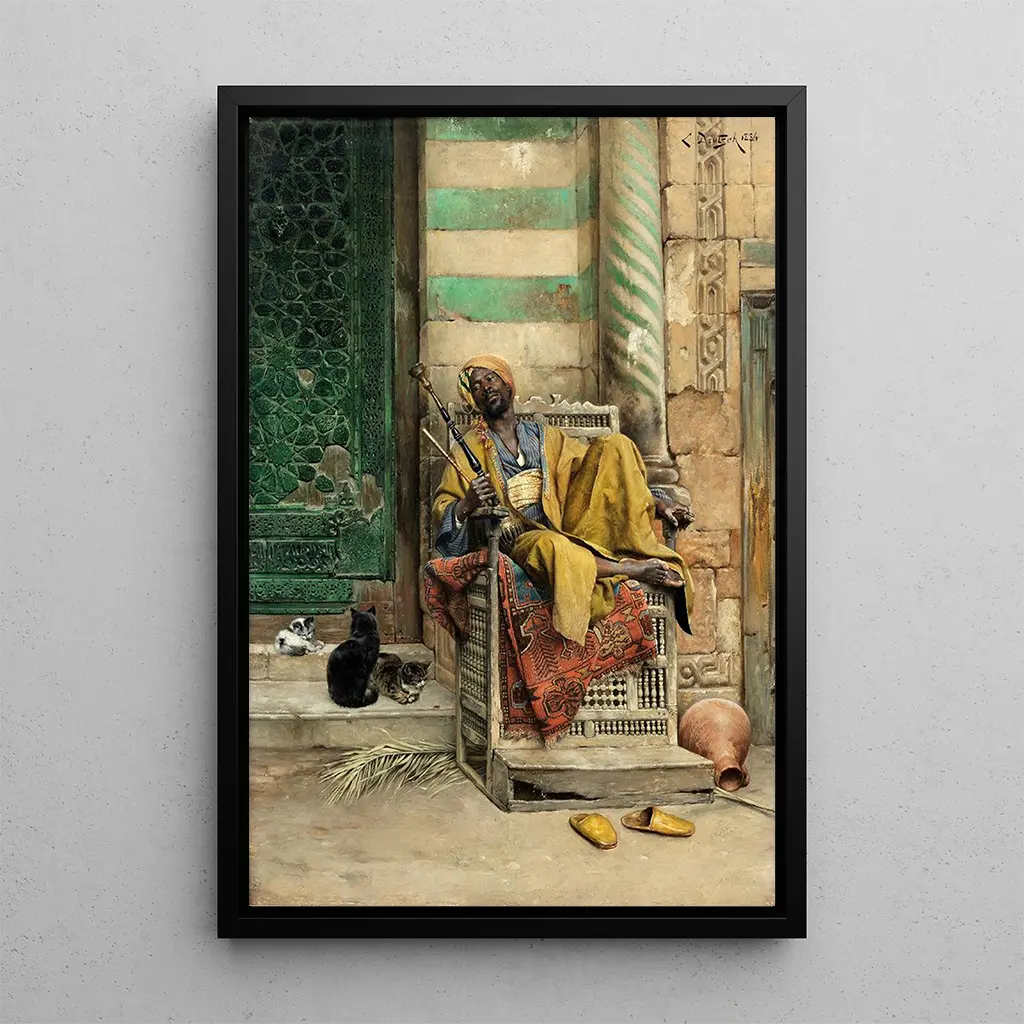 Le Fumeur de goza : a captivating scene of life In this artwork, Ludwig Deutsch transports us to a richly colored and detailed oriental universe. The art print "Le Fumeur de goza" depicts a seated man, immersed in contemplation of a water pipe, surrounded by objects typical of oriental culture. The warm hues of ochre and red blend harmoniously, creating an atmosphere that is both intimate and soothing. Deutsch's technique, which combines precision and sensitivity, allows us to feel the depth of the character's emotions while highlighting the textures of textiles and accessories. This art print is a true invitation to discover a fascinating world. Ludwig Deutsch : a master of orientalism Ludwig Deutsch, born in 1855 in Vienna, is an Austrian painter renowned for his orientalism art prints. Influenced by travels and explorers' accounts, he captured the essence of daily life in Middle Eastern countries. His period of creation mainly spans the late 19th century, a time when orientalism experienced significant growth in European art. Deutsch stands out for his attention to detail and realistic approach, which earned him a reputation among the great artists of his time. His works, such as "Le Fumeur de goza," testify to his talent and commitment to representing oriental culture with respect and authenticity. A decorative acquisition with multiple advantages The art print of "Le Fumeur de goza" is an ideal choice to enhance your interior decoration. Whether in a living room, office, or bedroom, this art print will add a touch of exoticism and sophistication to your space. The quality of the reproduction guarantees perfect fidelity to the colors and details of the original artwork, allowing you to fully enjoy the aesthetic appeal of this scene. By choosing this canvas, you opt for a piece that sparks curiosity and admiration, while creating a warm and welcoming atmosphere in your interior.