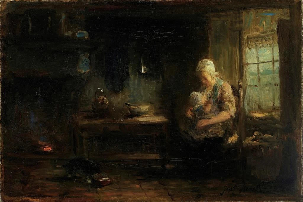 The Young Mother is a touching artwork that captures the essence of motherhood with rare delicacy. The painting depicts a mother holding her child in her arms, bathed in a soft light that emphasizes the tenderness of the moment. The warm colors and meticulous details of the faces convey a palpable emotion, creating an intimate and comforting atmosphere. Israëls, with his oil painting technique, succeeds in capturing not only the physical features but also the love and deep connection between the mother and her child, making this piece a true visual poem.