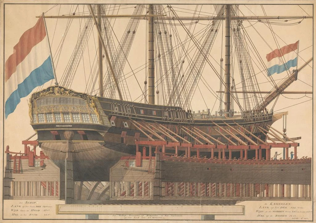 The art print The Zoutman ship on camels captures a fascinating moment in maritime history, where commerce and adventure meet. This piece depicts a majestic ship loaded with goods, while camels stand proudly beside it, symbolizing the connection between sea and desert. The vibrant colors and meticulous details bring this dynamic scene to life, evoking the movement and energy of a time when international trade was booming. The atmosphere of the artwork transports the viewer to a world of exploration and discovery.