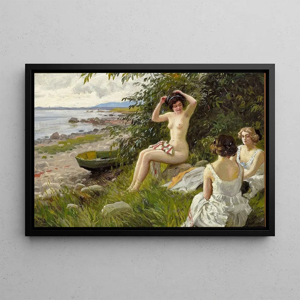 In this art print of Three Bathers by the Shore, Paul Fischer captures the essence of a summer day on the coast. The bathers, wrapped in colorful drapes, relax in the sun, while the waves gently lap the shoreline. The pastel hues, blending shades of blue, pink, and sand, create a soothing and joyful atmosphere. Fischer's technique, combining realism and impressionism, brings this scene to life, inviting the viewer to feel the warmth of the sun and the whisper of the sea.