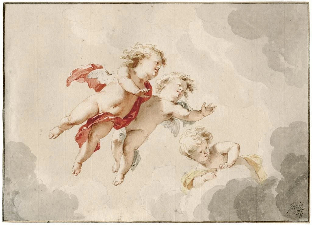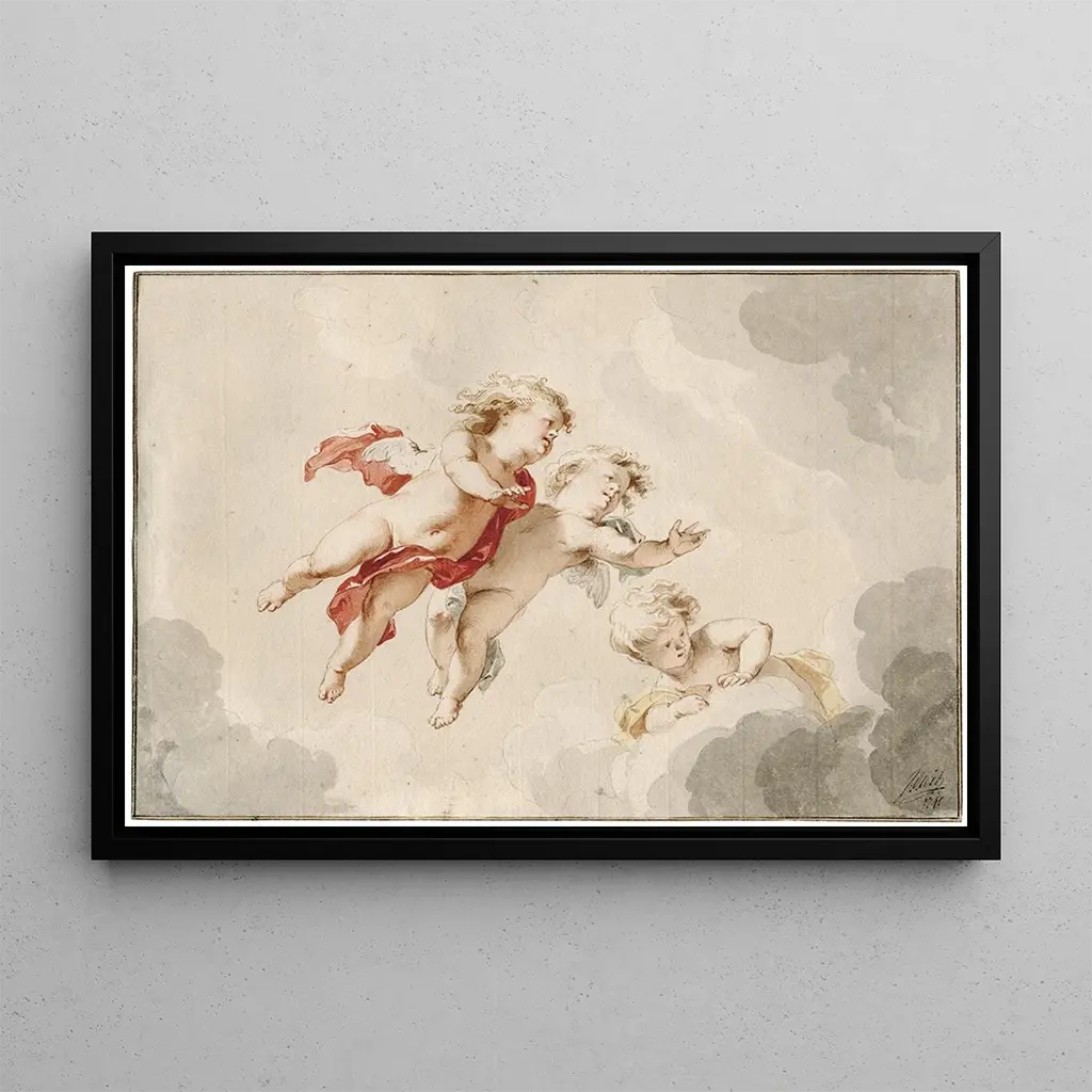 In this captivating art print, Jacob de Wit transports us to an airy universe where three putti, these charming little angels, seem to float gracefully. The composition is a true ballet of pastel colors, where soft shades of pink, blue, and cream blend harmoniously. The oil painting technique captures the delicacy of the faces and drapery, creating an atmosphere that is both joyful and dreamy. Every detail, from the expressions of the putti to the nuances of the shadows, contributes to the impression of a scene suspended in time, inviting the viewer to marvel at this divine lightness.