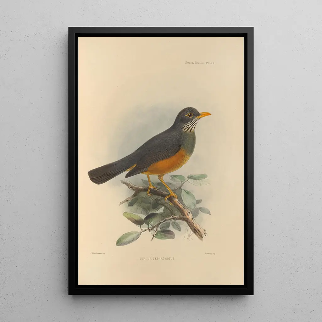 Turdus Tephronotus: a tribute to avian biodiversity The art print Turdus Tephronotus, created by Henry Seebohm, presents a striking depiction of a thrush with vibrant colors. The vivid hues and precise details of the bird evoke the richness of biodiversity. The watercolor technique, executed with mastery, allows for expressing the lightness and grace of this bird in full flight. The atmosphere emanating from this piece invites contemplation, revealing the fleeting beauty of nature and the harmony that exists between species. Henry Seebohm: an artist at the heart of ornithology Henry Seebohm, an emblematic figure of 19th-century ornithology, successfully combined science and art through his works, including Turdus Tephronotus. His passion for birds led him to explore various continents, enriching his knowledge and his art. Influenced by the naturalist currents of his time, Seebohm accurately captured the characteristics of each species, becoming a pioneer in ornithological representation. His work has contributed not only to art but also to science, raising public awareness of the beauty and diversity of birds. A decorative art print with multiple assets The reproduction of Turdus Tephronotus is a perfect decorative choice to bring a touch of nature into your interior. Whether in a living room, office, or bedroom, this art print will captivate attention and inspire admiration. Its printing quality guarantees fidelity to the colors and details of the original, making this piece a true aesthetic asset. By integrating this canvas into your decor, you create a harmonious and soothing space, while celebrating the beauty of thrushes and the richness of our environment.