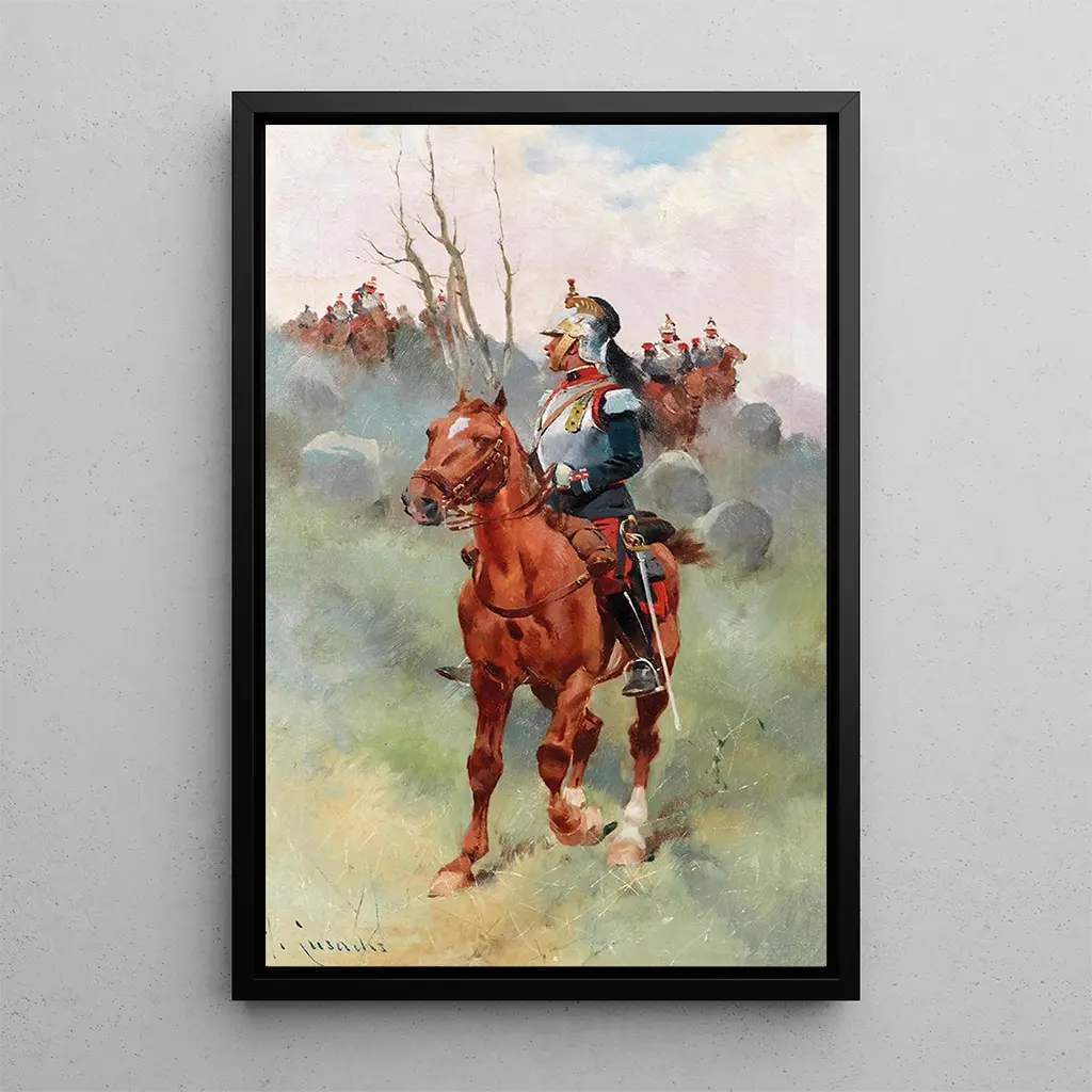 In At the Head of the Troops, José Cusachs depicts a moment of heroism and determination, where a military leader stands proudly at the forefront. The vibrant colors and meticulous details of the uniforms and horses create a striking dynamic. The composition, centered on the figure of the leader, conveys a sense of movement and energy, capturing the essence of courage and strategy. The atmosphere is both dramatic and inspiring, inviting the viewer to immerse themselves in the military universe of the 19th century, where honor and duty took precedence.