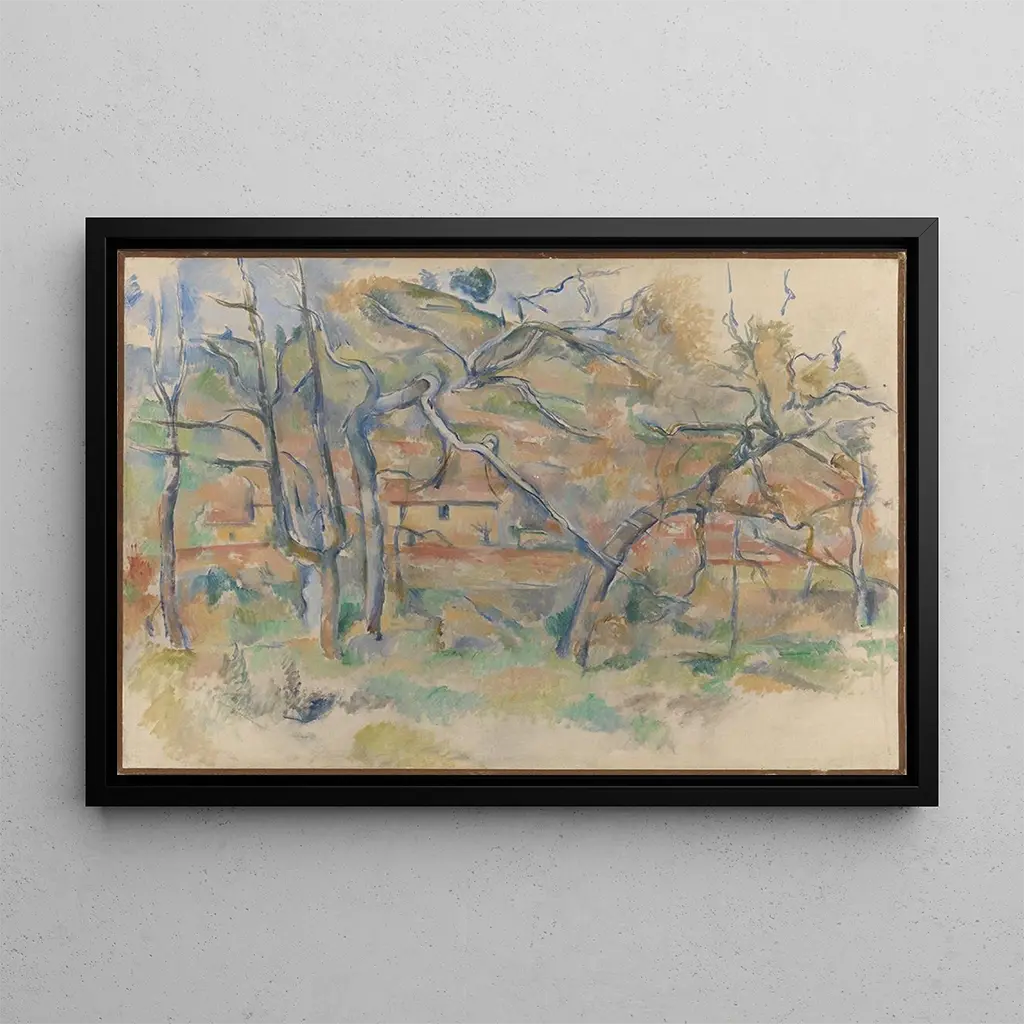 Paul Cézanne, an emblematic figure of post-impressionism, marked art history with his innovative approach. Born in 1839 in Aix-en-Provence, he drew inspiration from the landscapes of his native region while experimenting with color and form. Influenced by masters such as Delacroix and Pissarro, Cézanne sought to capture the essence of objects rather than their mere appearance. His work paved the way for many artistic movements of the 20th century, making him an essential pillar of modern art. "Trees and House in Provence" is a perfect example of his unique style, blending tradition and innovation.