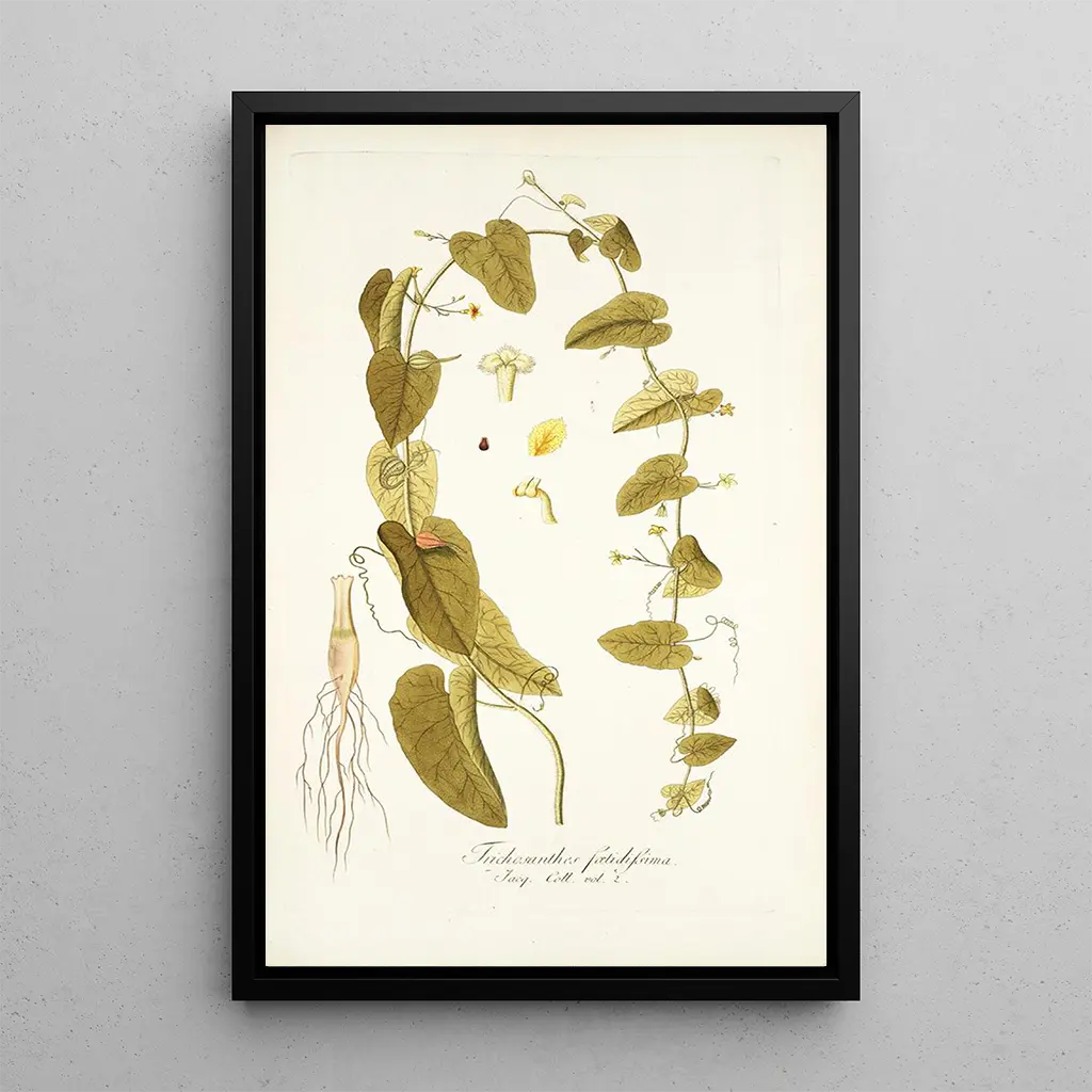 Trichosanthes foetidissima: an explosion of colors and shapes The art print of Trichosanthes foetidissima transports us into a vibrant world, where the bright colors of this tropical plant captivate the eye. The vivid shades of yellow and green, mixed with touches of red, create a lively and dynamic tableau. The artist's technique, which combines watercolor and drawing, allows for capturing the unique texture of this plant, with its bell-shaped flowers and broad leaves. This artwork not only evokes the beauty of nature but also its mysterious and fascinating side. Nikolaus Joseph Freiherr von Jacquin: art in the service of science Nikolaus Joseph Freiherr von Jacquin, born in 1727, is an iconic figure in botanical illustration of the 18th century. His travels through the tropics enriched his knowledge of exotic plants, and his work is marked by a desire to capture the diversity of the plant world. Influenced by the scientific currents of his time, Jacquin was able to combine scientific rigor and artistic sensitivity, making his illustrations references for both botanists and art enthusiasts. His legacy endures, demonstrating the importance of botany in art. A decorative acquisition with multiple assets The art print of Trichosanthes foetidissima is a bold decorative choice that will brighten any space. Whether in a living room, an office, or a bedroom, this piece adds a touch of freshness and exoticism. Its print quality and color fidelity make it an attractive work for all who appreciate the beauty of nature. By integrating this canvas into your decor, you create a warm and inspiring atmosphere, while paying tribute to the richness of tropical flora.