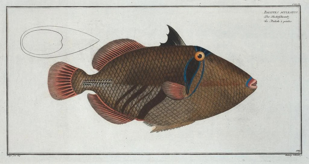 Balistes aculeatus : a dive into the marine world The art print of "Balistes aculeatus" immerses us in the fascinating universe of the deep sea. This artwork, depicting a colorful fish, highlights the intricate details of the animal's anatomy, as well as the vibrant nuances of its scales. The vivid colors, ranging from green to blue with touches of yellow, evoke the richness of underwater life. Marcus Elieser Bloch, with his precise technique and keen sense of observation, manages to capture not only the appearance of the fish but also its essence, making this piece both scientific and artistic. Marcus Elieser Bloch : the 18th-century naturalist artist Marcus Elieser Bloch, born in 1723, was a German naturalist and artist whose works marked the 18th century. Specializing in the representation of aquatic fauna, he contributed to the knowledge of marine species through his detailed illustrations. Bloch traveled across Europe, studying and documenting various fish, which allowed him to create works of remarkable accuracy. His book "Ichthyology" is considered a reference in the field, combining art and science, and demonstrating the importance of meticulous observation in naturalist art. A decorative acquisition with multiple assets The art print of "Balistes aculeatus" is a captivating decorative piece that will enhance your interior, whether in an office, a game room, or a space dedicated to the sea. Its printing quality ensures exceptional fidelity to the colors and details of the original artwork, adding an exotic touch to your decor. This artwork, with its aesthetic appeal and educational character, is ideal for sparking curiosity and wonder, transforming your space into a place of inspiration and discovery. Treat yourself to this unique piece and let yourself be seduced by the beauty of the marine world.