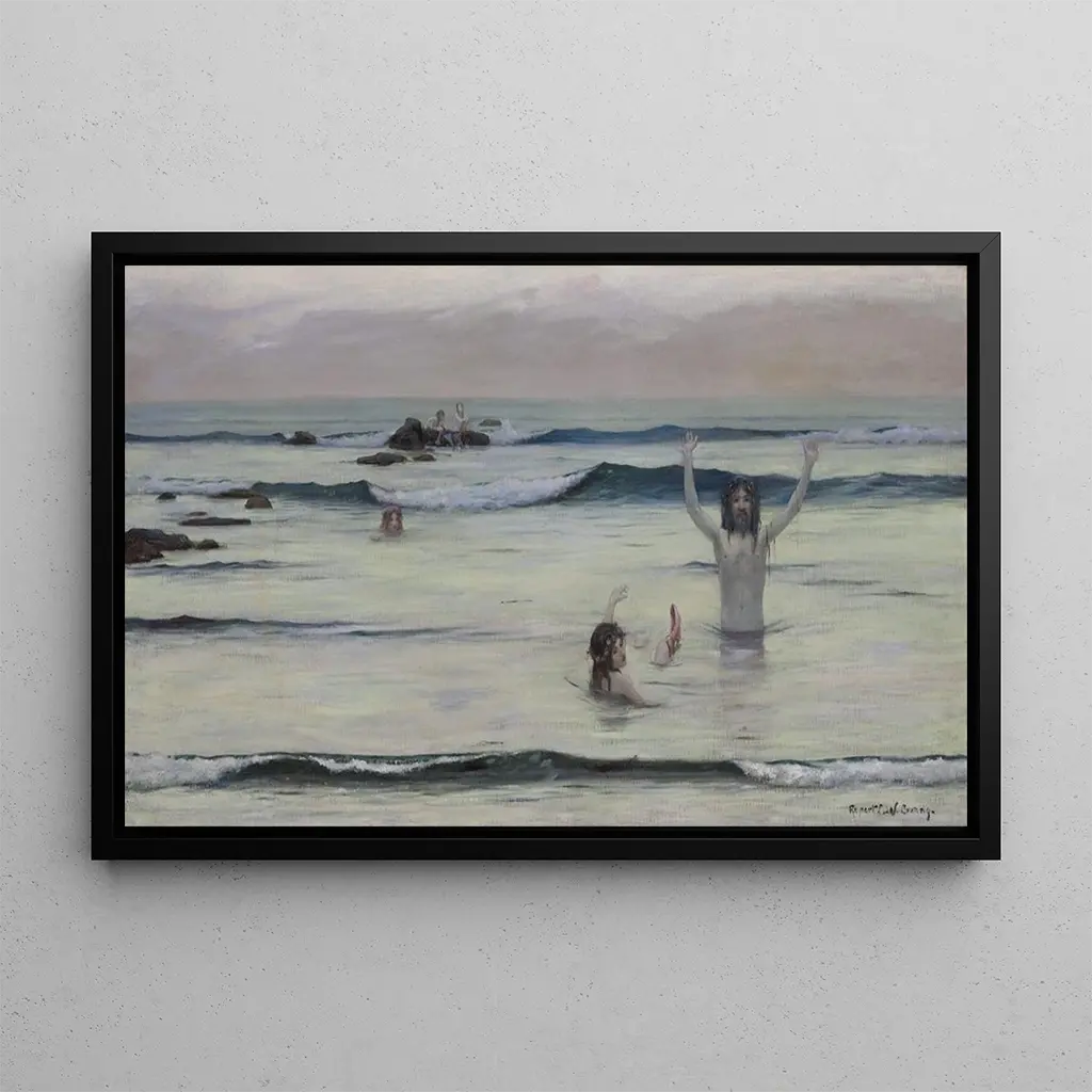 The canvas "Tritons" by Rupert Bunny is a celebration of the sea and its mythological creatures. In this artwork, Bunny depicts majestic tritons, symbols of aquatic power and grace. The vibrant colors and fluid movements of the characters create a captivating dynamic, while the underwater background glows with shimmering reflections. The atmosphere is both mystical and enchanting, inviting the viewer to dive into a world where nature and myth meet. This poetic representation of the sea showcases Bunny's talent for capturing beauty and wonder.