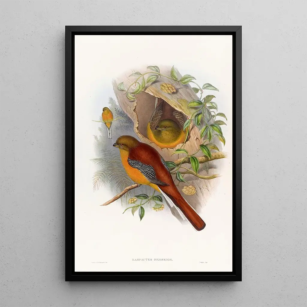 Trogon montagnard : an ode to avian beauty The Trogon montagnard, with its vibrant colors and delicate plumage, is a true jewel of nature. In this art print, the artist captures the majesty of this bird, highlighting its bright shades of green, blue, and red. The composition is carefully balanced, allowing the viewer to immerse themselves in a world where fauna and flora meet harmoniously. The engraving technique used by John Gould adds depth and texture to the image, making every detail of the plumage almost tangible. The atmosphere conveyed by this artwork is both serene and captivating, inviting wonder at the beauty of biodiversity. John Gould: a pioneer of artistic ornithology John Gould, a 19th-century British naturalist and ornithologist, is renowned for his significant contributions to the study of birds. His passion for ornithology led him to travel around the world, collecting specimens and creating illustrations with remarkable precision. Influenced by the scientific discoveries of his time, Gould mastered the art-science fusion, producing works that are both aesthetically pleasing and informative. His series of ornithological illustrations, including the Trogon montagnard, is considered a treasure of artistic and scientific heritage. Gould left a lasting legacy, inspiring many generations of artists and scientists. A decorative acquisition with multiple benefits The art print of the Trogon montagnard is a decorative piece that will enhance any space, whether a living room, office, or bedroom. Its print quality and fidelity to the original colors make it an ideal choice for art and nature enthusiasts. By integrating this artwork into your decor, you add a touch of elegance and sophistication while celebrating the beauty of the animal world. The aesthetic appeal of this canvas lies in its ability to spark conversations and ignite curiosity, making this piece a valuable addition to your collection.