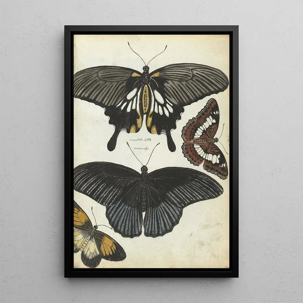 The art print "Indian Butterflies" by Jan Brandes transports us to a lively universe where the lightness of insects blends with a richness of colors. Each butterfly, delicately painted, seems to come to life, with wings adorned with fascinating patterns that capture the light. The color palette, ranging from deep blues to bright yellows, creates a joyful and dynamic atmosphere. Brandes succeeds in conveying the elegance and fragility of these creatures, offering an invitation to contemplate the ephemeral beauty of nature.