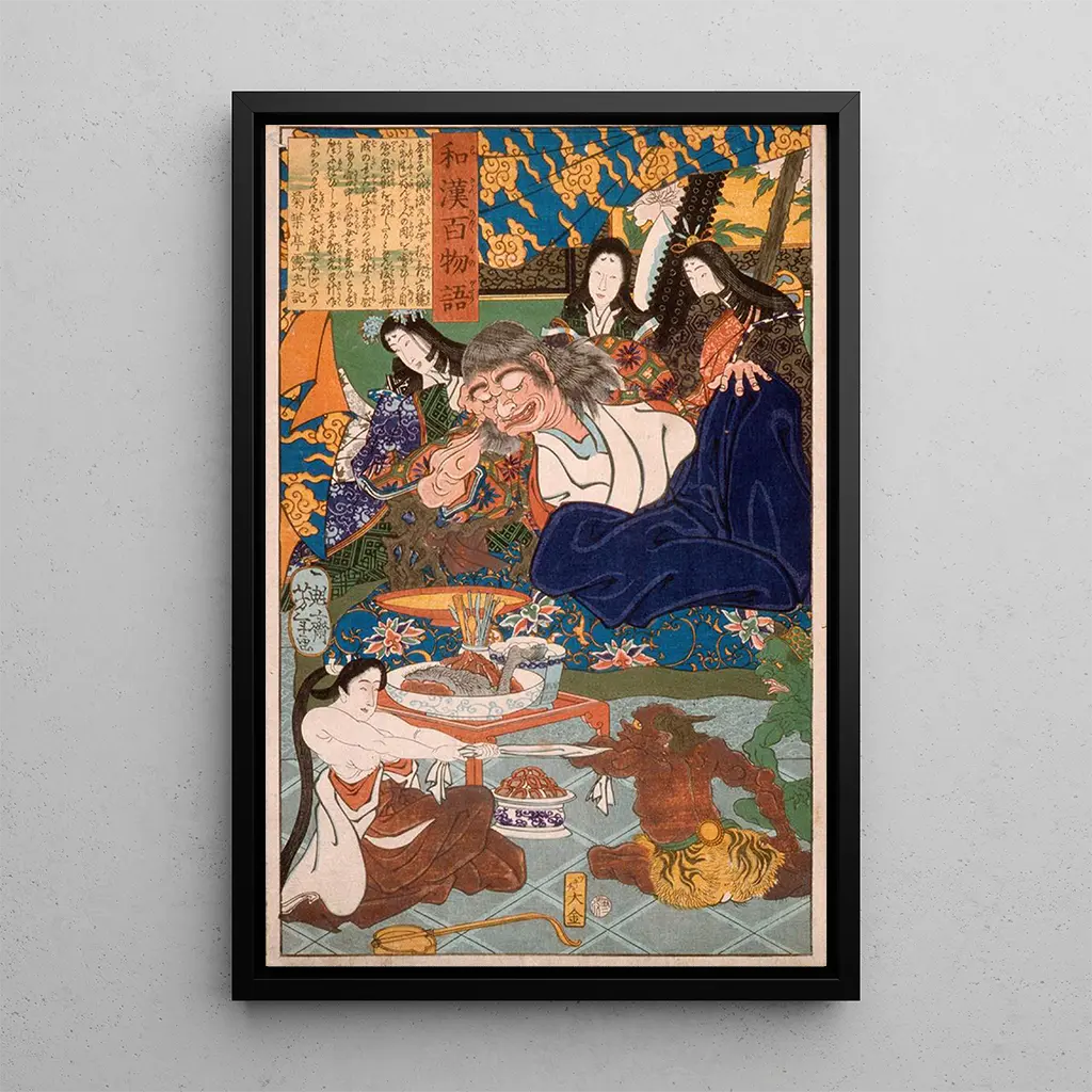 In this art print of Shutendji surrounded by women, artist Tsukioka Yoshitoshi immerses us in a world rich in colors and emotions. The dynamic composition highlights the central character, Shutendji, a legendary demon, surrounded by women who appear both fascinated and fearful. The vivid hues and meticulous details of traditional Japanese clothing add depth to the scene, while the expressions of the characters convey an atmosphere of mystery and tension. The woodblock engraving technique, characteristic of ukiyo-e, allows Yoshitoshi to play with light and shadow, creating a striking visual effect.