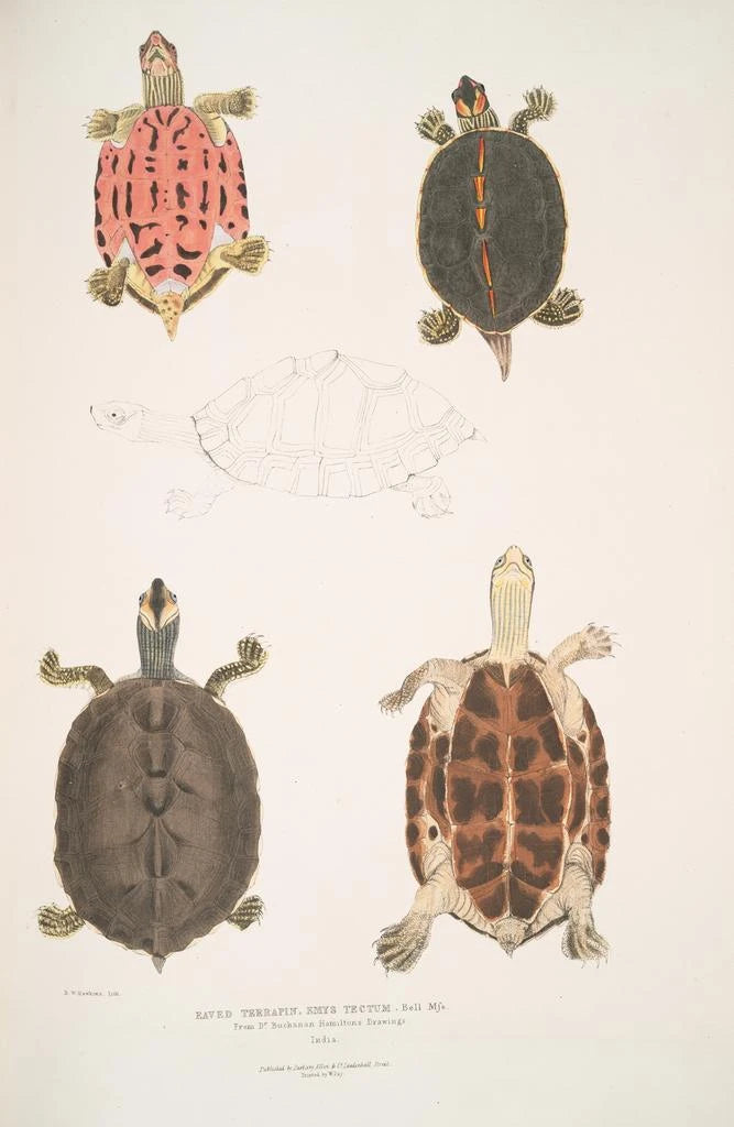 John Edward Gray, renowned for his contributions to zoology in the 19th century, dedicated a significant part of his career to the study of reptiles and amphibians. His work was characterized by a rigorous scientific approach, combined with a developed artistic sense. Gray mastered the art of blending meticulous observation of nature with aesthetic representation, making his illustrations references in the field. The turtle with roof, emblematic of aquatic biodiversity, is a perfect example of his talent for capturing wildlife with precision and beauty.