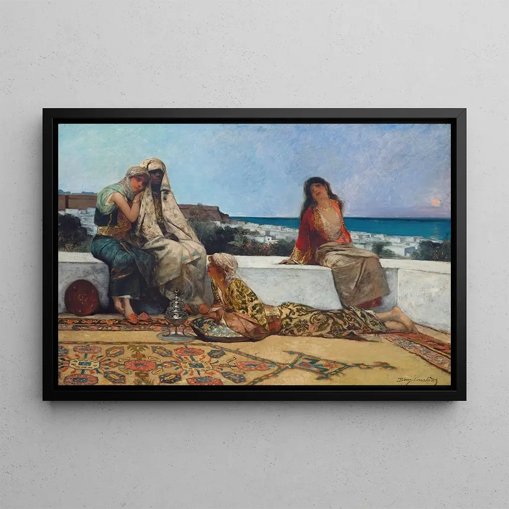 The art print "Twilight Hours" by Jean-Joseph Benjamin-Constant is a work that evokes the magic of the moments of transition between day and night. The warm, golden colors blend with darker shades, creating a striking contrast that captures the eye. The oil on canvas technique allows for the light to be captured in an almost tangible way, bringing the characters and their environment to life. The atmosphere emanating from this canvas is both melancholic and dreamlike, inviting the viewer to immerse themselves in this fleeting moment where time seems suspended.
