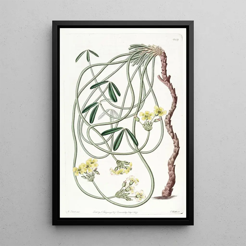 The art print of the work "Oxalis tortueux" by Sydenham Edwards transports us into a vibrant world of colors and forms. The shades of green and violet blend gracefully, creating a dynamic composition that catches the eye. Each leaf and flower is rendered with remarkable detail, showcasing Edwards' talent for capturing the complexity of nature. This canvas evokes a sense of lightness and movement, as if the plants are dancing under a gentle breeze, inviting visual exploration.