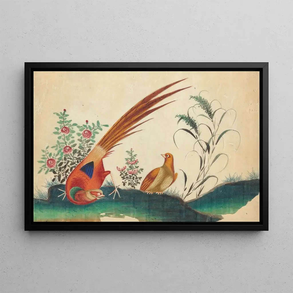 The art print Deux oiseaux, fleurs, anonymous work, evokes a suspended moment in time. The delicate silhouettes of the birds, surrounded by vibrant flowers, create a harmonious and soothing composition. The pastel colors, soft and luminous, infuse an atmosphere of lightness and serenity. Every detail, from the birds' feathers to the flower petals, is rendered with precision that reflects exceptional craftsmanship. This canvas invites contemplation, offering a poetic view of the ephemeral beauty of nature.