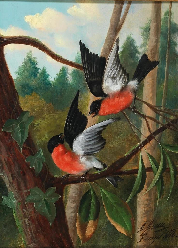 In the art print of Two Birds in Dispute, Michelangelo Meucci immerses us in an animated and dynamic scene. The vivid colors, from deep blues to bright reds, illustrate the tension and energy of the captured moment. Meucci's technique, characterized by meticulous details and striking contrasts, allows us to almost feel the movement of the birds. This piece, both lively and expressive, evokes the struggles and rivalries that exist in the animal kingdom, while offering a reflection on nature and its interactions.