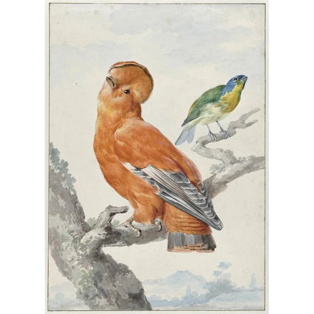 Aert Schouman, Dutch painter of the 18th century, is renowned for his representations of exotic birds. His style, influenced by the baroque, is characterized by striking realism and particular attention to detail. Schouman managed to capture the very essence of his subjects, paying homage to the beauty of nature. His works, often created for collectors and aristocrats, reflect a time when the exploration of distant lands and the discovery of new species fascinated the world. By immortalizing these birds, he not only enriched art but also contributed to the ornithological knowledge of his era.