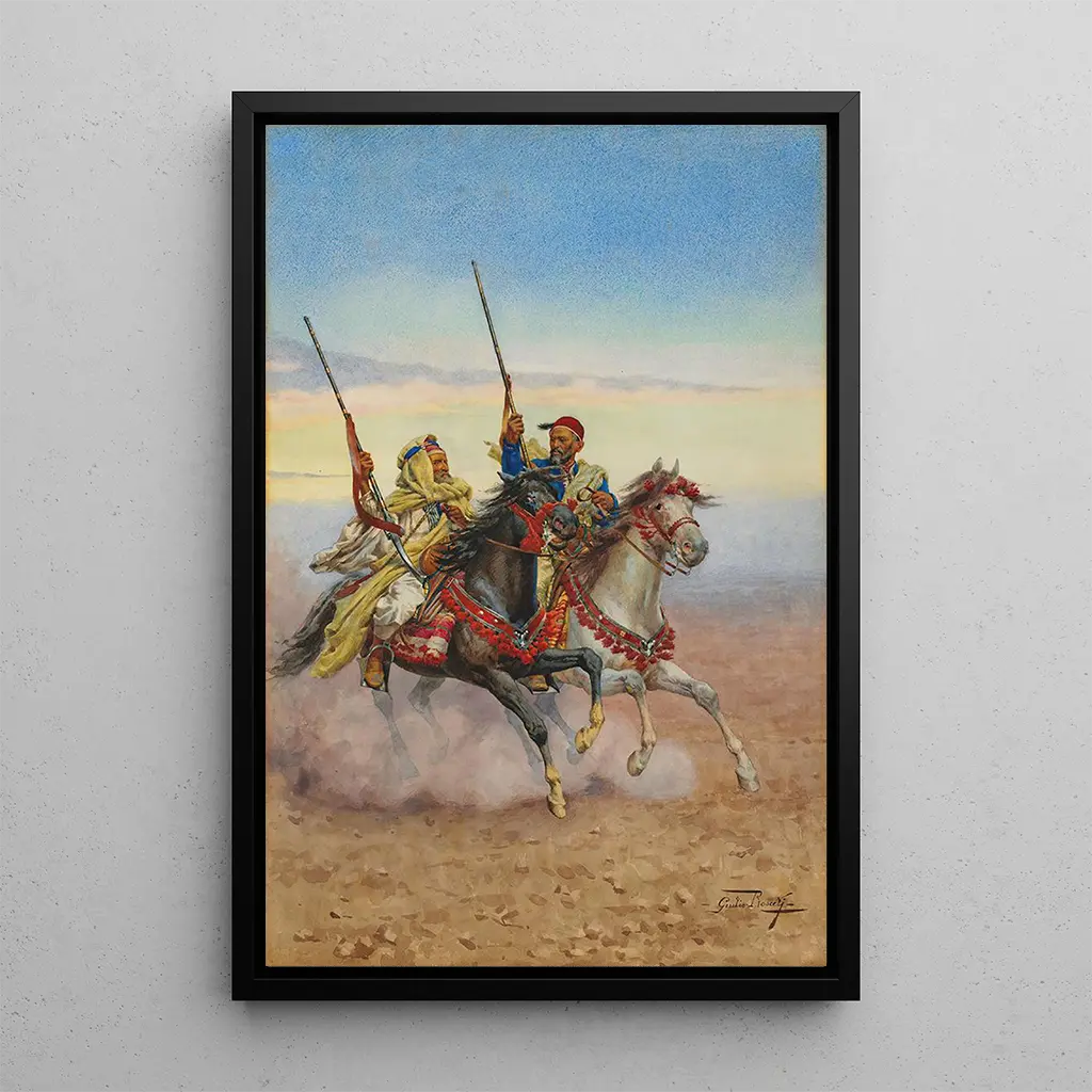 Deux cavaliers : une danse équestre sous le ciel azur Dans "Deux cavaliers", Giulio Rosati nous transporte dans un moment de grâce équestre, où deux cavaliers, vêtus de costumes traditionnels, semblent danser avec leurs montures sous un ciel d'un bleu éclatant. La composition est soigneusement équilibrée, chaque détail, des chevaux aux vêtements, est rendu avec une précision remarquable. Les couleurs vibrantes, allant des bruns chauds des chevaux aux nuances éclatantes des costumes, créent une atmosphère vivante et dynamique. La technique de Rosati, caractérisée par un réalisme saisissant, permet de ressentir l'énergie du mouvement et la beauté de la scène, invitant le spectateur à s'immerger dans cette représentation vivante de la culture équestre. Giulio Rosati : un maître du réalisme orientaliste Giulio Rosati, peintre italien du XIXe siècle, est reconnu pour son talent à capturer des scènes de la vie orientale avec une précision et une sensibilité uniques. Influencé par ses voyages en Afrique du Nord et au Moyen-Orient, Rosati a su intégrer des éléments de ces cultures dans ses œuvres, faisant de lui une figure emblématique du mouvement orientaliste. Son style, marqué par un souci du détail et une utilisation habile de la lumière, lui a permis de se démarquer parmi ses contemporains. "Deux cavaliers" témoigne de son habileté à représenter non seulement des personnages, mais aussi l'âme de la culture qu'il dépeint, faisant de chaque tableau une fenêtre sur un monde fascinant. Une acquisition décorative aux multiples atouts La art print de "Deux cavaliers" est une pièce décorative qui saura enrichir n'importe quel intérieur, que ce soit dans un salon, un bureau ou une chambre. Sa qualité d'impression garantit une fidélité aux couleurs et aux détails de l'œuvre originale, permettant de profiter pleinement de la beauté de cette scène équestre. Avec son attrait esthétique indéniable, cette toile devient un point focal qui suscite l'admiration et la curiosité des visiteurs. En intégrant cette art print dans votre décoration, vous apportez une touche d'élégance et d'histoire, tout en célébrant l'art de Giulio Rosati.