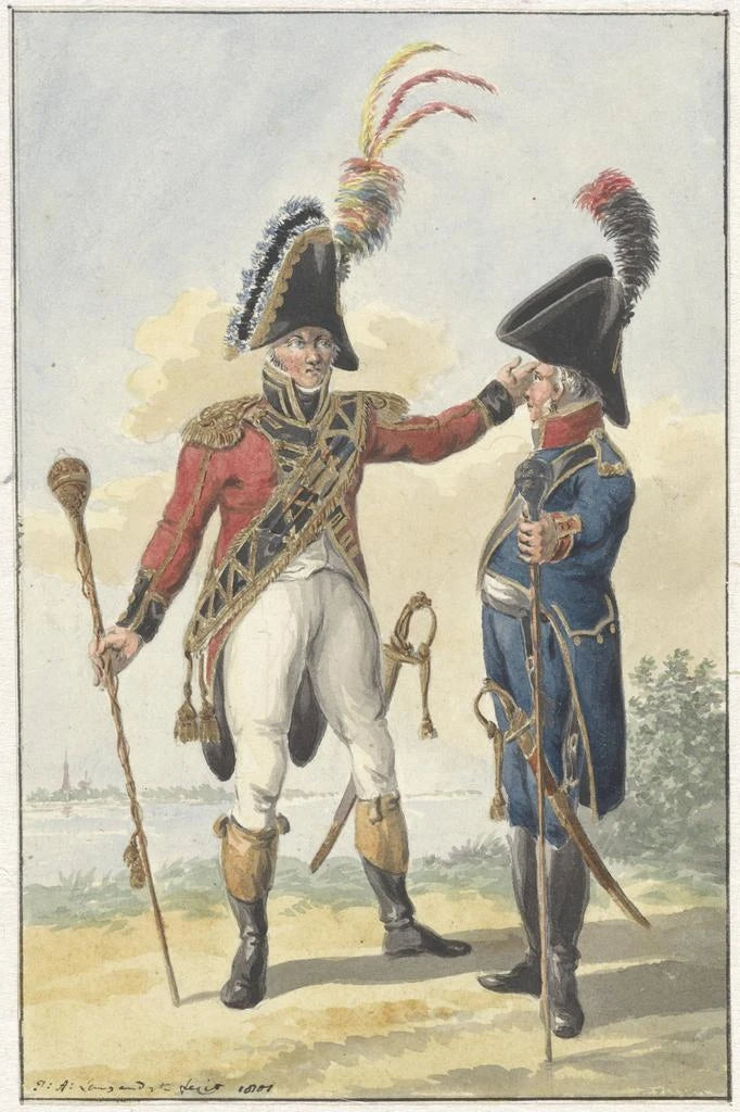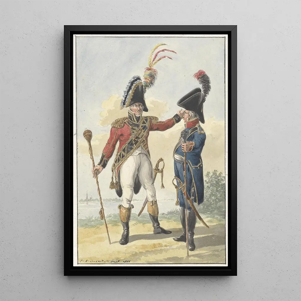 In the artwork "Two officers standing," Jan Anthonie Langendijk immerses us in an atmosphere filled with nobility and pride. The two figures, dressed in their military uniforms, stand upright, symbols of authority and loyalty. The color palette, dominated by rich shades of blue and gold, evokes the grandeur of their status. Langendijk's technique, which skillfully blends realism with a touch of romanticism, captures not only the details of the uniforms but also the intensity of the exchanged gazes. This art print invites the viewer to feel the strength and determination of the officers, while offering a reflection on duty and honor.