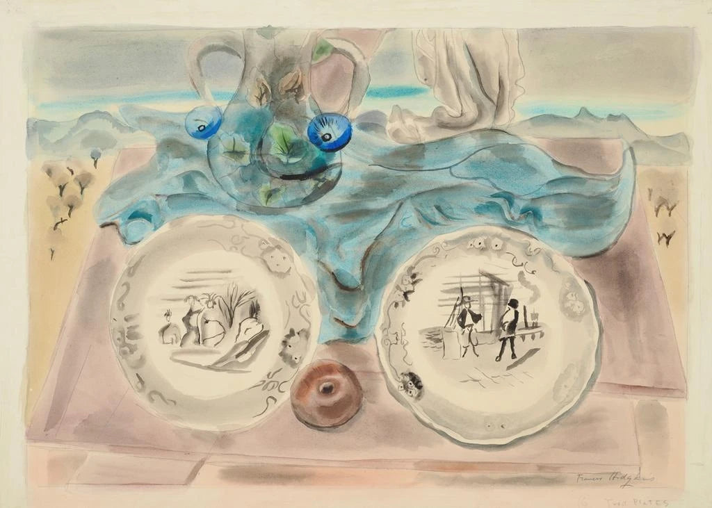 Frances Hodgkins offers us with Two Plates a vibrant artwork that celebrates the beauty of everyday objects. The composition, centered on the plates, is enhanced by bright floral patterns that intertwine gracefully. The colors, ranging from deep reds to bright greens, create a captivating visual harmony. The watercolor technique, mastered by Hodgkins, allows play with transparency and light, bringing each detail to life. This canvas, both simple and rich, invites us to appreciate the beauty of ordinary things.
