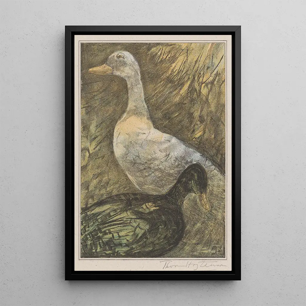 Two Standing Ducks: A Natural Elegance in Full Motion In "Two Standing Ducks," Theo van Hoytema depicts a lively scene where the ducks, proudly upright, seem ready to take flight. The vibrant color palette, blending shades of green, blue, and brown, evokes a rich and dynamic natural environment. The technique employed by the artist, with fluid and expressive brushstrokes, infuses a sense of movement and life into these birds. This art print is a celebration of nature, capturing a moment where the grace of the ducks is highlighted, encouraging the viewer to appreciate the beauty of the animal world. Theo van Hoytema: An Artist at the Heart of Nature Theo van Hoytema, active at the end of the 19th century, is a Dutch painter whose work is distinguished by its naturalist approach. Influenced by Impressionism, he skillfully integrates elements of light and color to bring his subjects to life. His passion for wildlife and flora is evident in each of his art prints, where he manages to capture fleeting moments of wild life. Van Hoytema was also a pioneer in exploring the relationships between animals and their environment, making him an essential artist of his time. His art prints, such as that of "Two Standing Ducks," continue to inspire and delight art enthusiasts. A decorative acquisition with multiple assets The art print of "Two Standing Ducks" is a decorative choice that will add a touch of freshness and vitality to your space. Whether in a living room, office, or bedroom, this poster will captivate attention and spark conversations. Its reproduction quality ensures fidelity to the details and colors of the original artwork, while adding an aesthetic dimension to your decor. With its natural charm and energy, this canvas is a valuable addition for any art and nature lover, enriching your living environment.