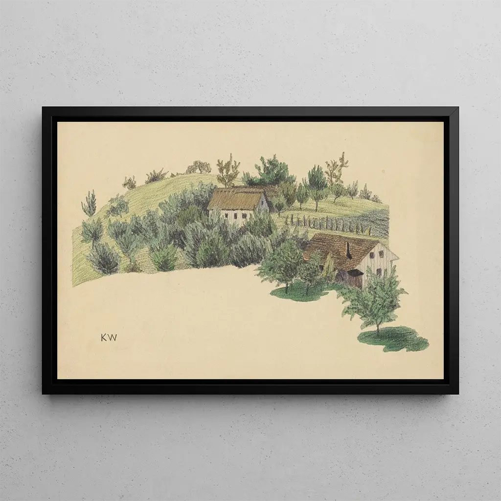 In the work "Untitled Houses of Peasants on Hill," Karl Wiener immerses us in a rural landscape filled with simplicity and authenticity. The houses, set on a lush green hill, are bathed in a soft light that accentuates the textures of the roofs and walls. The composition is balanced, with gentle lines guiding the eye across the painting. The earthy colors and shades of green evoke a peaceful, almost nostalgic atmosphere, reminiscent of a time when rural life was at the heart of human concerns.