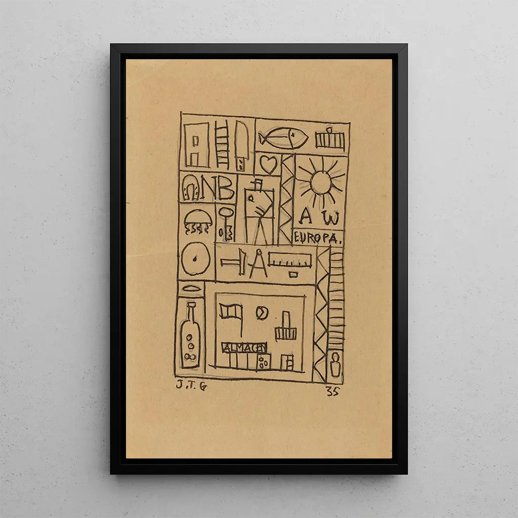 The artwork "Untitled" by Joaquín Torres-García is a bold exploration of abstraction, where shapes and colors meet in a harmonious dance. This painting, devoid of a title, invites personal interpretation, encouraging the viewer to immerse themselves in a universe of sensations and emotions. The dynamic lines and vibrant hues create an atmosphere that is both energetic and contemplative, reflecting the artist's quest to transcend reality. Each element of the composition seems to dialogue with the others, forming a coherent whole that stimulates the imagination.